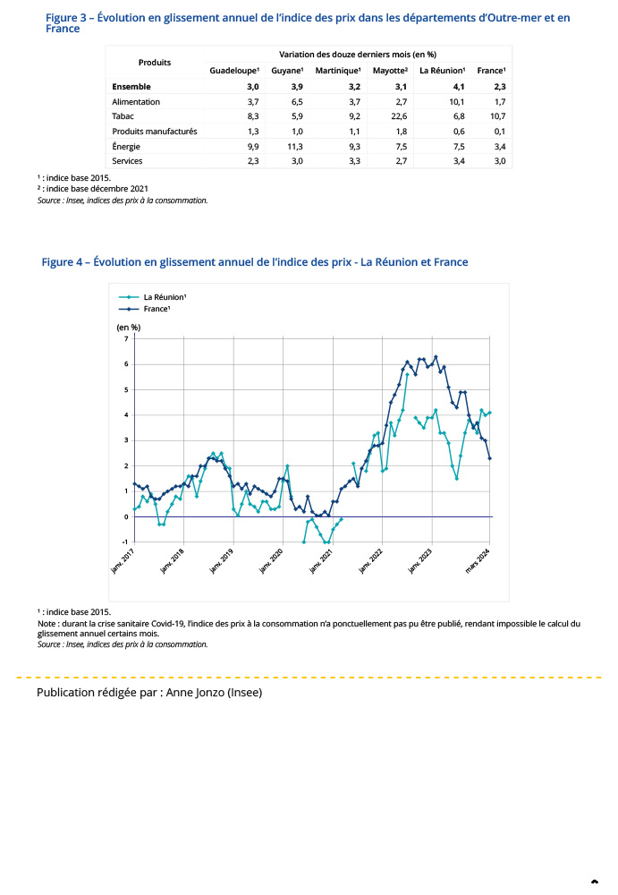 Sur un an, l’indice des prix à la consommation augmente davantage à La Réunion (+4,1 %) qu’au niveau national (+2,3 %).