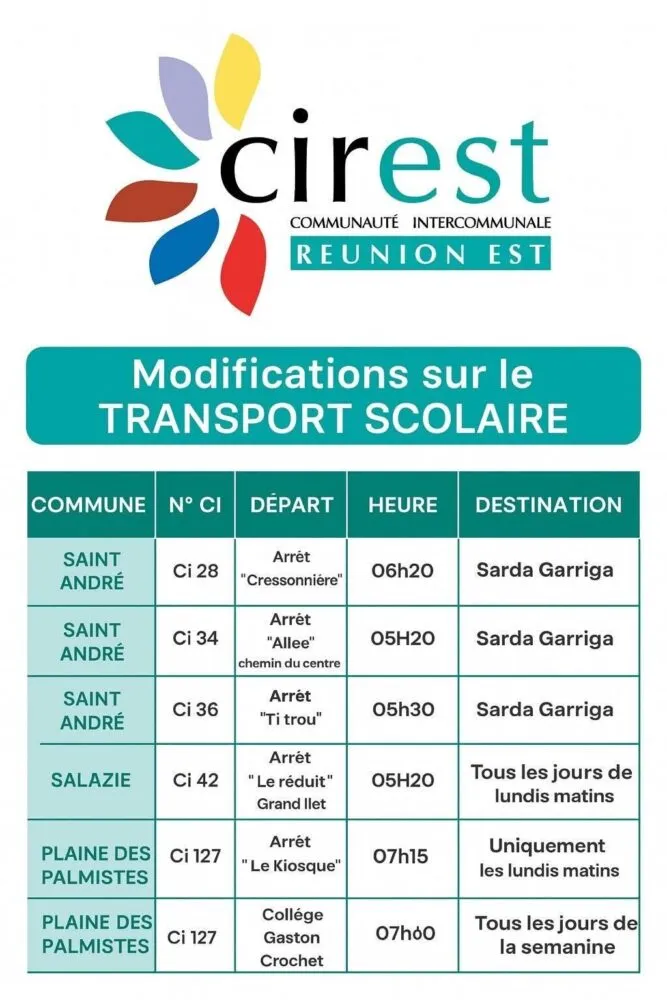 Quelle galère depuis deux ans le transport scolaire à la Cirest c’est le chaos organisé. Les enfants arrivent une fois sur deux en retard le matin à Saint-Denis. Mais qui gère cette m**** ???? On a licencié des gens et puis on a embauché d’autres, ce n’est pas suffisant ? Où est le problème ? Dépêchez vous de trouver une solution, on en a marre que nos enfants arrivent en retard tous les matins ou presque avec ces bus scolaires de la cires !!!!!!!!!!!