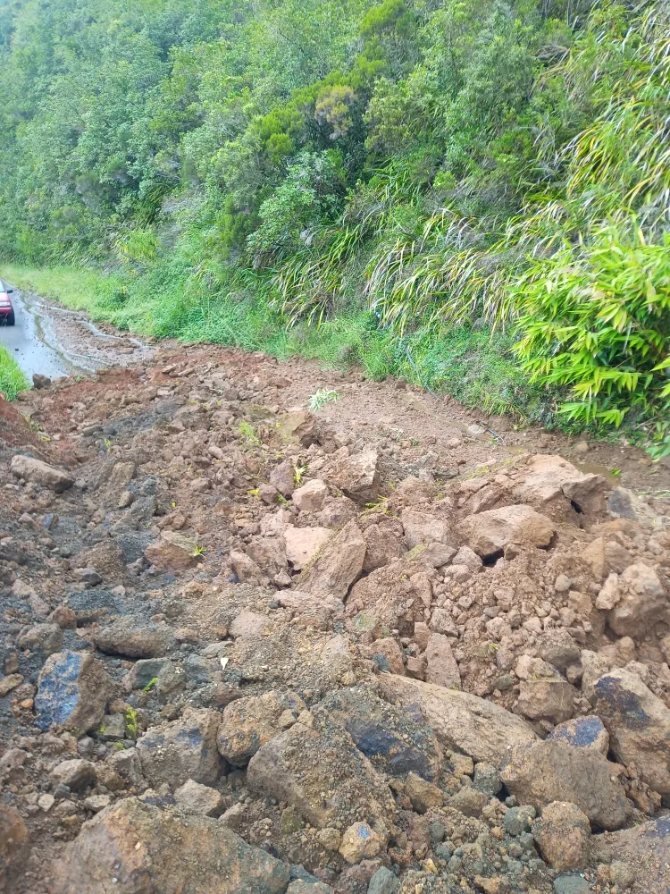 7H45 :RD48 Route de Salazie au lieu-dit la Passerelle, éboulis, route totalement fermée à la circulation. RN2 Ste Rose route des Laves, chaussée inondée par endroit. Circulation difficile. Suite à cet éboulis , des travaux de dégagement d’une voie de circulation sont en cours. Des convois seront organisés uniquement entre 17h et 18h.