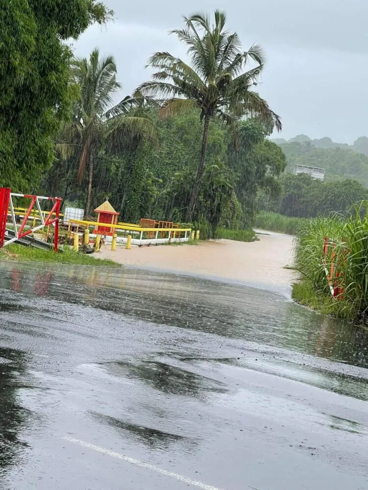 7H45 : Petite Rivière St Jean, chaussée inondée, circulation impossible sens E/N (véhicule coincé l’usager a pu sortir).