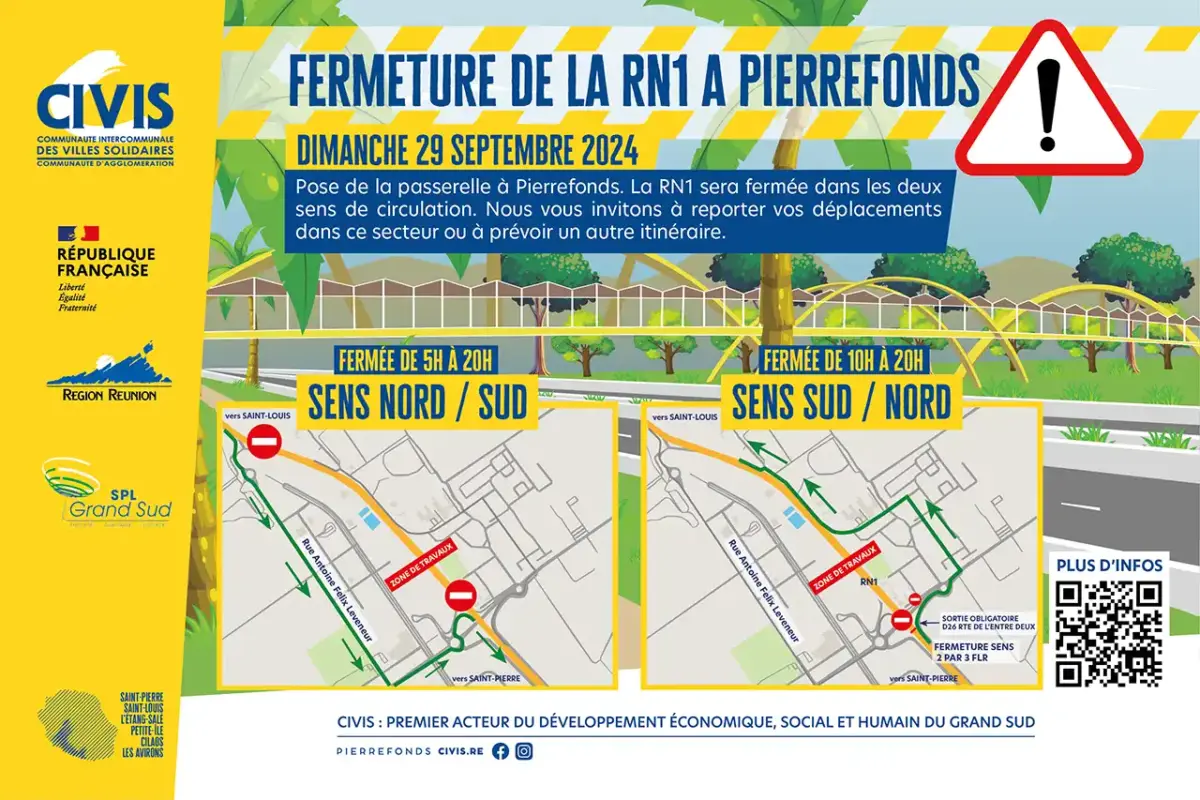 Le CRGT vous informe que sur la RN1 à Saint Pierre, dans le cadre du chantier de réalisation de la passerelle piétonne de Pierrefonds, la 2×2 voies de Pierrefonds est fermée jusqu’à 20h dans le sens Nord/Sud, avec une déviation qui est mise en place par la bretelle de sortie déchetterie, ZAC Roland Hoareau, reprise de la RN1 par l’échangeur de Pierrefonds.