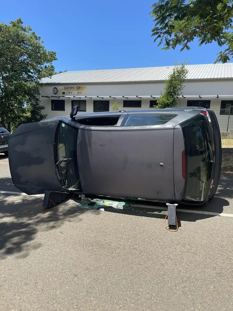 7h50 : rue Léopold Rambaud, Ste-Clotilde, en direction de l’Est, perte de contrôle d’un véhicule. Accident spectaculaire mais plus de peur que de mal