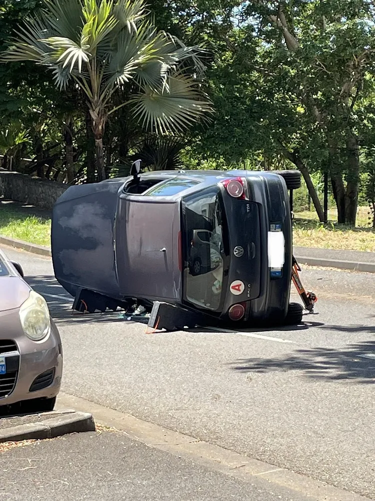 13h50 : une voiture sur le toit sous le Pont de Petit Bazar, en direction de St-Benoit, les pompiers, la Police sont sur place.