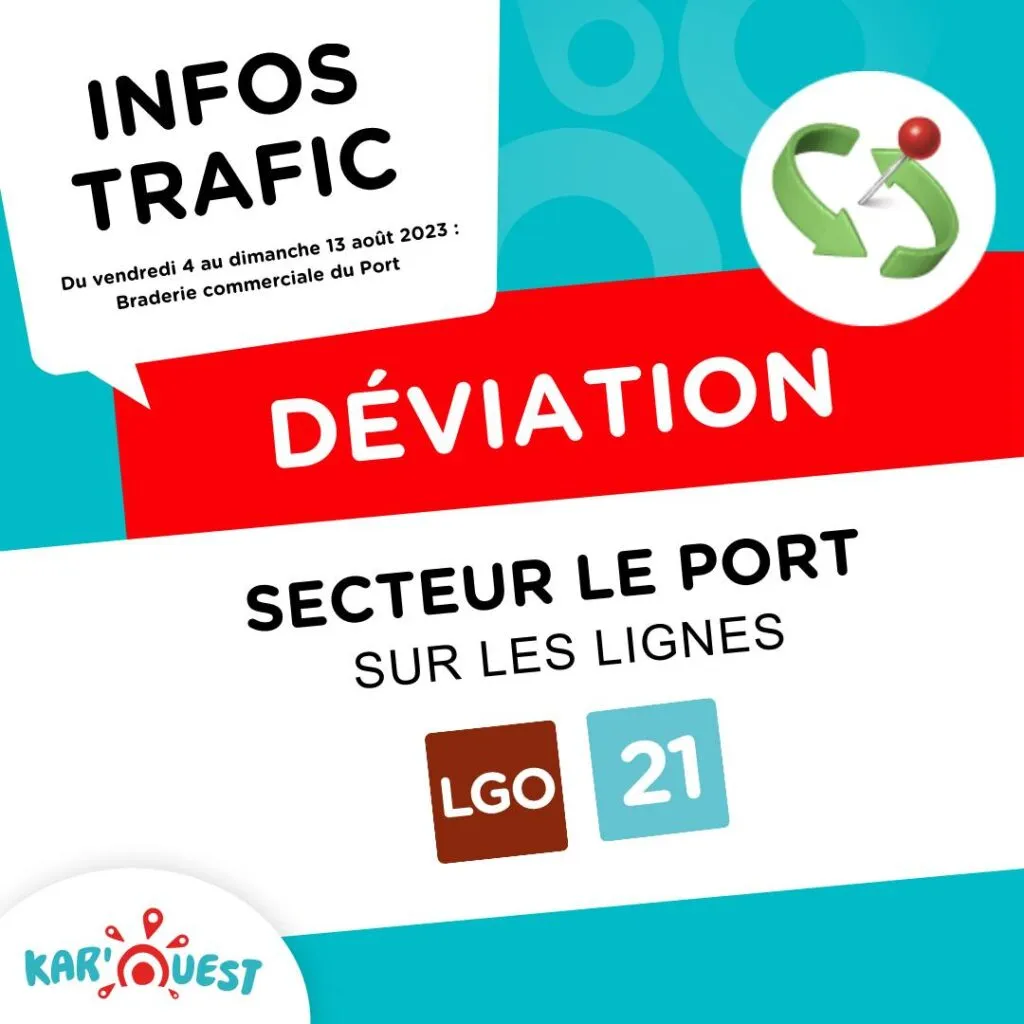 Jusqu’au dimanche 13 août 2023 , la Braderie commerciale du Port a pris ses quartiers au centre ville. De nombreuses bonnes affaires sont là aussi à réaliser avec des animations, mais il y a forcément des conséquences sur la circulation des bus. Kar’Ouest tenait à apporter des précisions sur les déviations de certaines lignes.