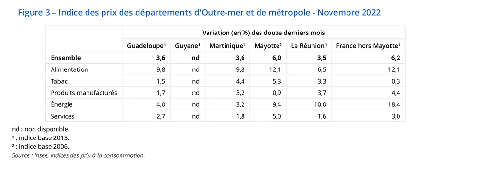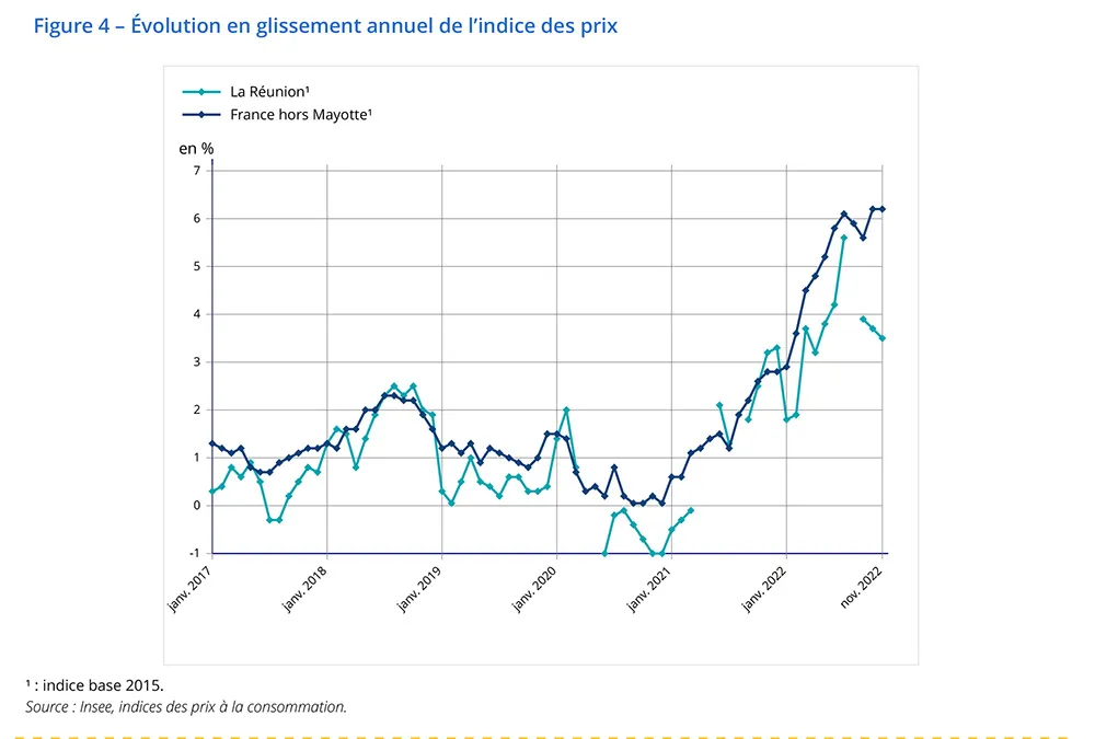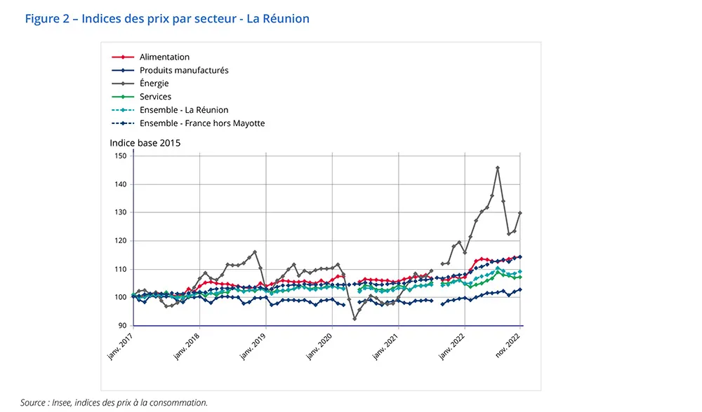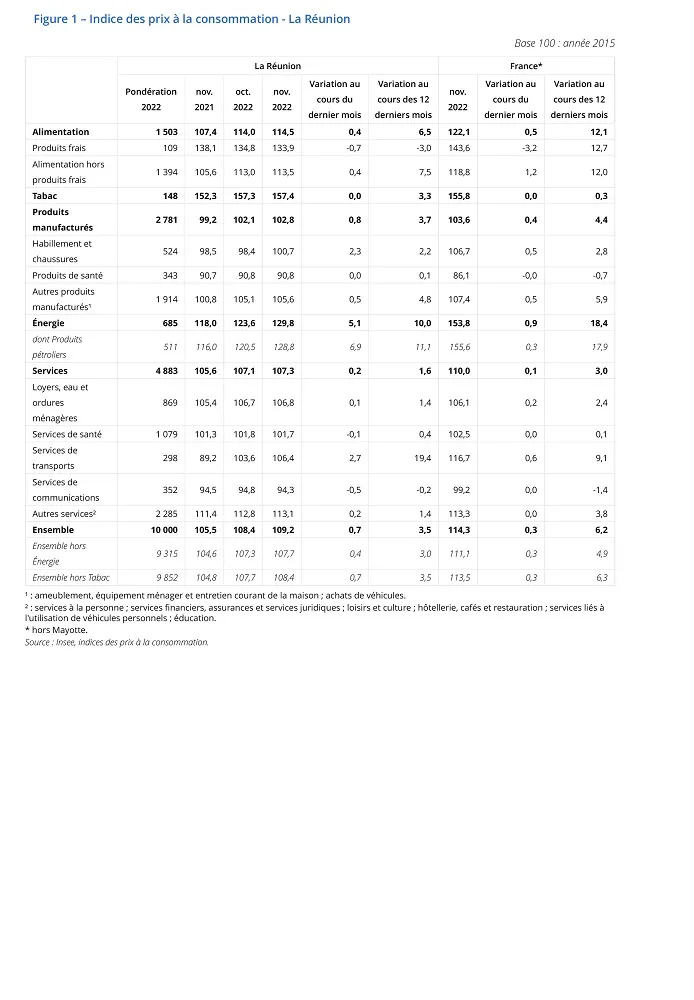 En novembre 2022, les prix à la consommation augmentent de 0,7 % à La Réunion, après + 0,2 % en octobre. Les tarifs de l’énergie augmentent fortement, du fait de la hausse des tarifs des produits pétroliers. La hausse se confirme pour les produits manufacturés et reprend dans les services. Dans l’alimentaire, les prix poursuivent leur hausse, à l’exception des produits frais.