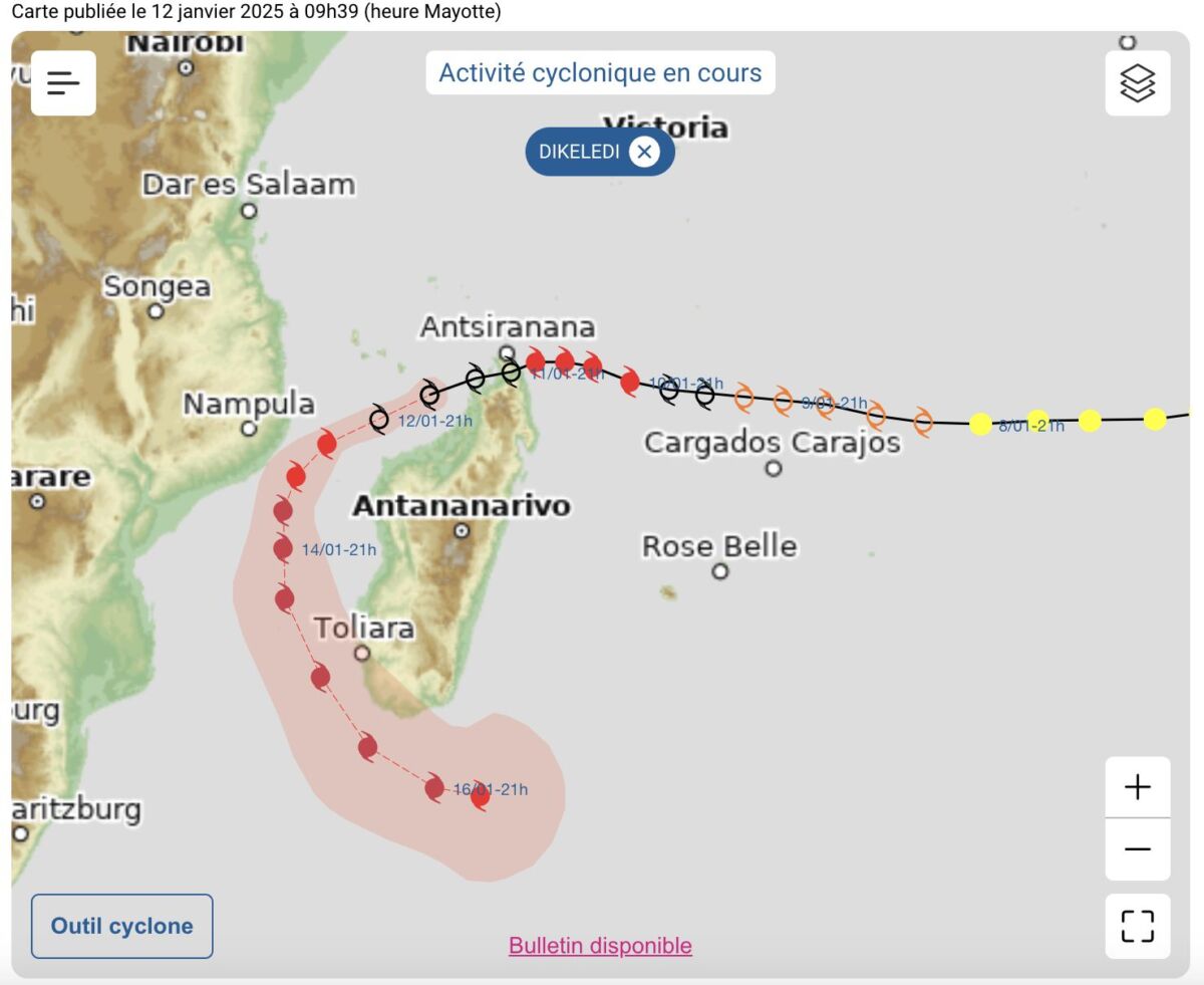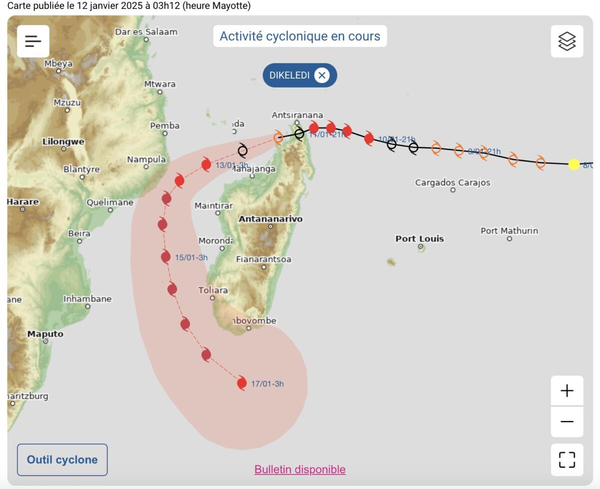 DIKELEDI se dirige vers Madagascar, où il pourrait toucher terre cet après-midi. Il traversera ensuite le canal du Mozambique, passant à proximité de Mayotte dans un état affaibli. Une forte dégradation des conditions météorologiques est attendue.