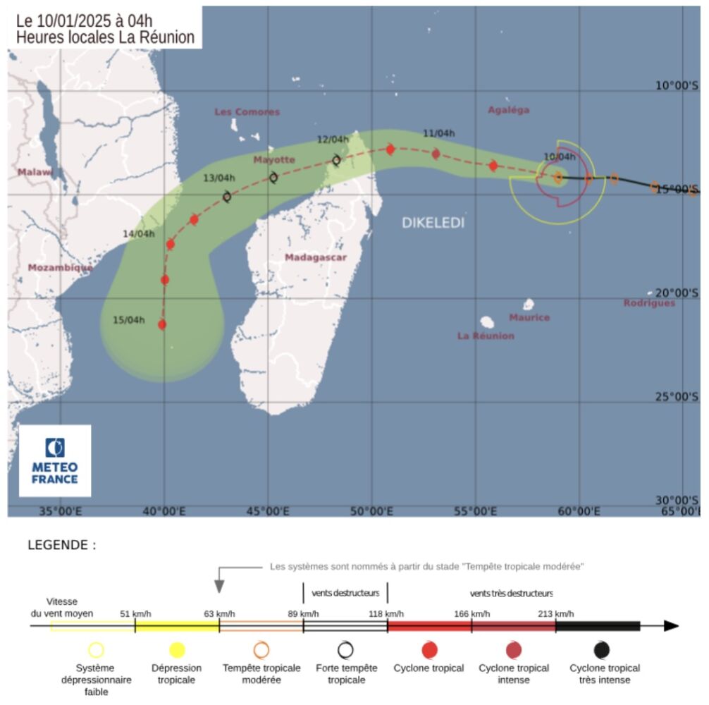 Ce vendredi 10 janvier, le système DIKELEDI, classé en tempête tropicale modérée, évolue à environ 830 km au nord-nord-est des côtes de La Réunion et 1500 km à l’est de Mayotte. Avec des vents moyens de 85 km/h et des rafales pouvant atteindre 120 km/h, le phénomène se déplace vers l’ouest à 28 km/h.