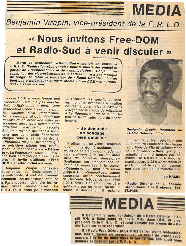 1982 Interview de Benjamin Virapin (Radio Détente N°1) par La Rédaction 14 septembre 1982 1 min de lecture Ne manquez pas toute l’actualité de La Réunion ! Abonnez-vous à la newsletter de Free Dom ! Valider Partager Facebook Twitter Pinterest Linkedin Whatsapp Reddit Email Vous pourriez être intéressé par 10 décembre 1982 Un canular par jour sur Radio Free Dom 11 octobre 1982 L’émission « pas de canard sans navet » 7 octobre 1982 L’émission « bleu outre-mer ou la radio de la méduse… » La Rédaction Laisser un commentaire Annuler la réponseYour email address will not be published. Enregistrer mon nom, mon e-mail et mon site dans le navigateur pour mon prochain commentaire. Current ye@r * Leave this field empty Article précédent Alexis commence à agacer Article suivant Exit la revue de presse de Radio Free Dom : pression de la droite au complot des socialistes et des communistes ? Articles récents... Hommage à Johnny Hallyday sur Free Dom 2 ce 5 décembre Mardi 30 décembre 2025 – Météo, éphéméride et horoscope du jour Saint-Joseph : découverte de 2337 plants de cannabis, arrestation de 2 individus Point sur le réseau routier départemental, 29 décembre à 16H30 Suicide sur le pont de la Rivière d’Abord : importante mobilisation des secours et des forces de l’ordre Radier submergé à Ilet Furcy : la route de Cilaos fermée à la circulation cette nuit Fortes pluies : appel à la plus grande prudence à Saint-Paul Saint-Gilles-les-Bains : une route impraticable, les riverains montent au créneau (VIDEOS) Très grands excès de vitesse : un délit passible de prison depuis le 29 décembre 2025 Fermeture temporaire du sentier de la Canalisation des Orangers (cirque de Mafate)