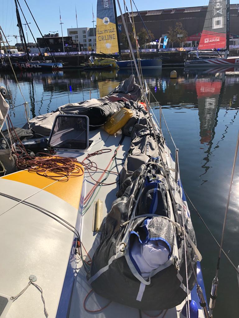 L’heure est donc au chargement des vivres mais aussi au choix du matériel à emmener à bord. Chaque équipage peut embarquer 8 voiles au total. « Il faut bien réfléchir en fonction des vents dominants. Nous avons déjà choisi 7 voiles et avons un dilemme sur la 8ème », nous confie Thomas.
