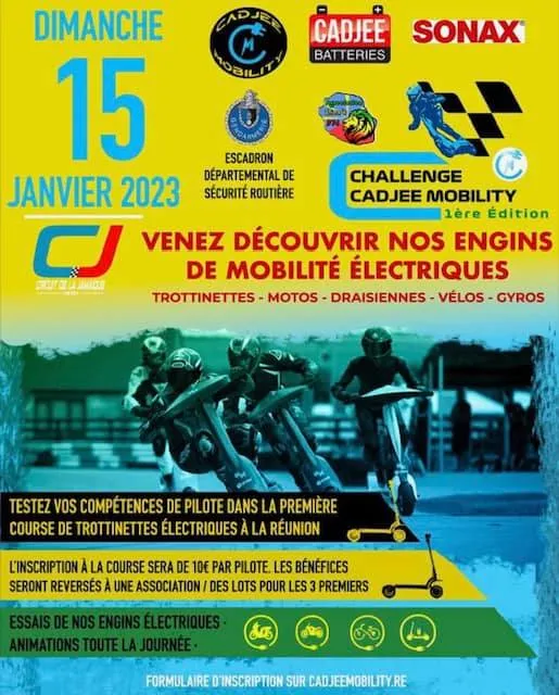 Le dimanche 15 janvier 2023, la société CADJEE MOBILITY a organisé la journée de la mobilité électrique et le 1er challenge Cadjee Mobility. Cet évènement s’est déroulé sur la piste de la Jamaïque à St-Denis.