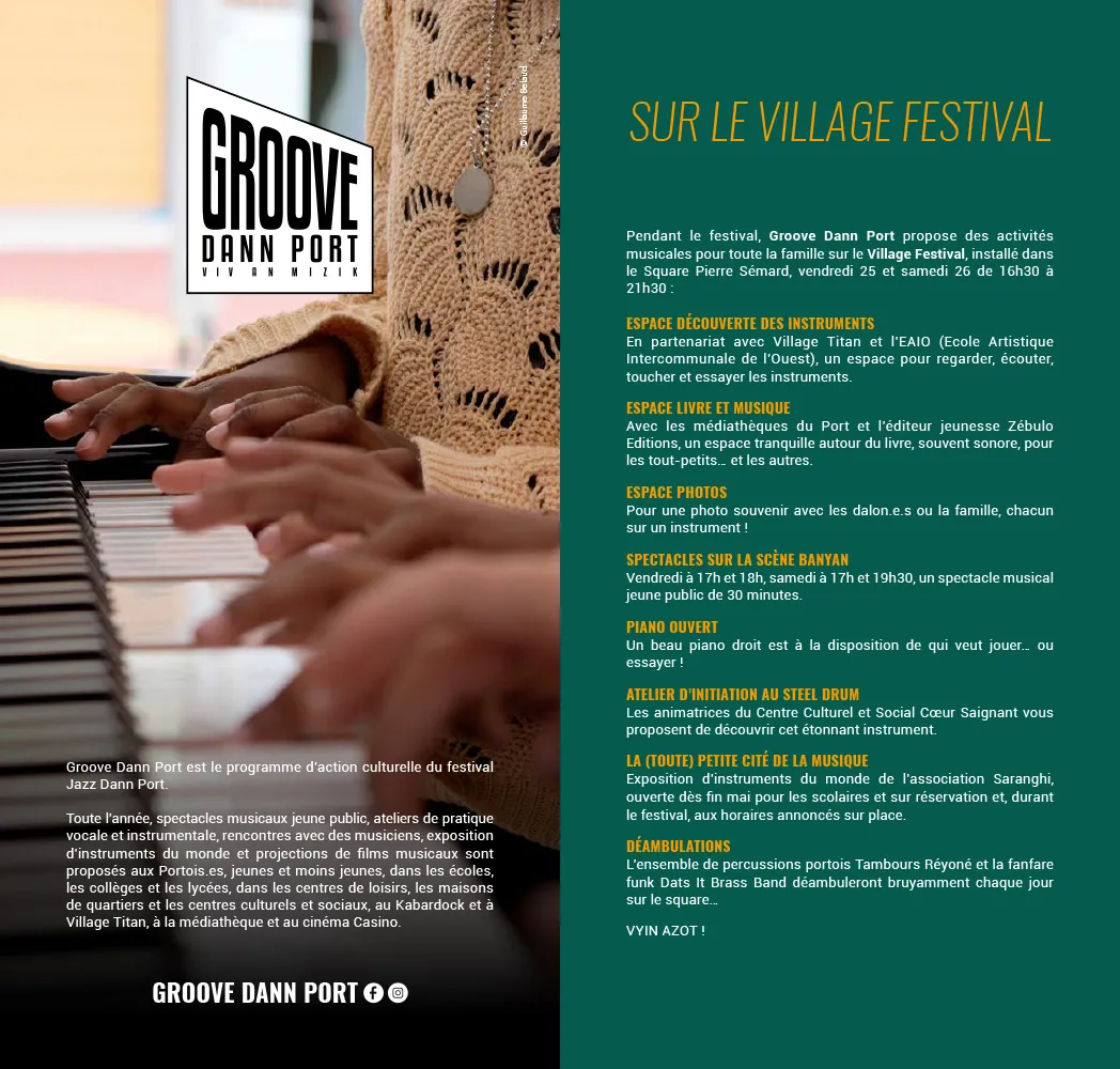 Sous le label Groove Dann Port, l’action culturelle est au cœur du festival. Des ateliers, des déambulations, des expositions d’instruments du monde, des mini-concerts pour enfants et même un piano en libre accès attendent le public du Square Pierre Sémard.