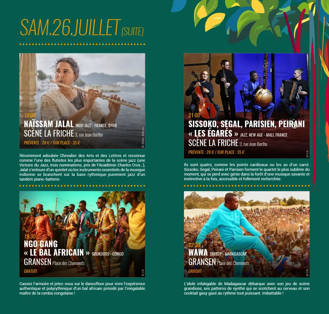 Côté gratuit, ne manquez pas Dats It Brass Band, Wawa, Ngo Gang, ou encore les DJ sets de Konsöle et Valentin Jolicœur sur la scène Sunset.