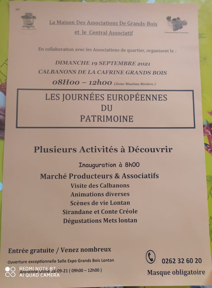 A l’occasion des Journées Européennes du Patrimoine les 18 et 19 septembre prochain, le maire de Saint-Pierre, le conseil municipal, les associations du quartier de Grands-Bois ainsi que la maison des associations de Grands-Bois et le central associatif organisent un marché producteurs et associatifs le dimanche 19 septembre.