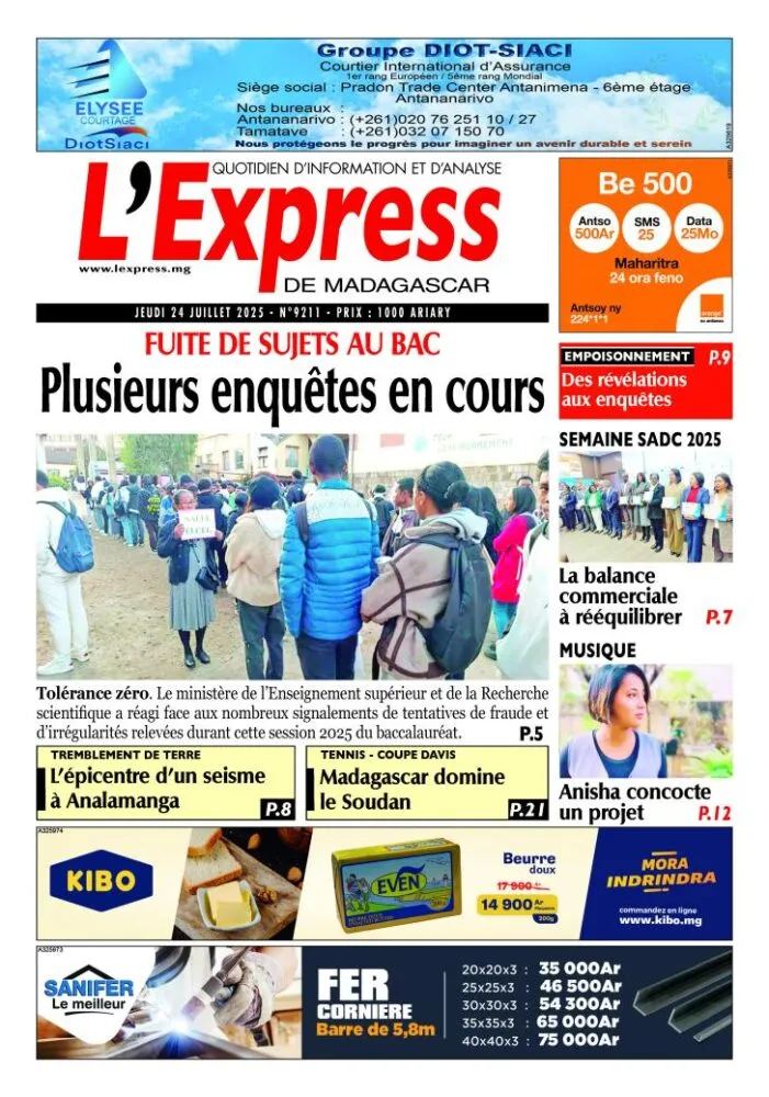 Dans son édition du jour, L’Express de Madagascar titre sur la fuite de sujets au baccalauréat et les multiples enquêtes ouvertes à ce sujet. Le ministère de l’Enseignement supérieur a réagi avec fermeté, promettant tolérance zéro. Parallèlement, la région d’Analamanga a été secouée dans la nuit par un séisme de magnitude 4,2 dont l’épicentre se situait à Ambohitrolomahitsy, provoquant des sueurs froides jusque dans les Hautes Terres. Sur un ton plus léger, Madagascar s’est imposé face au Soudan lors de la Coupe Davis, suscitant un rare moment d’unité nationale.