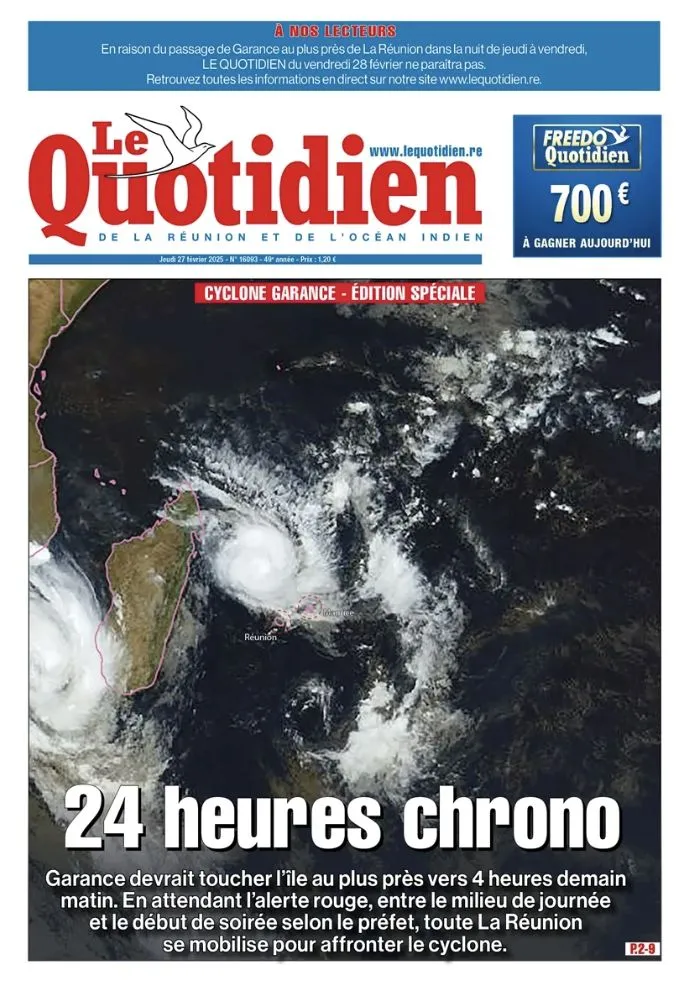Annonce aux lecteurs indique que Le Quotidien du vendredi 28 février 2025 ne paraîtra pas en raison du passage du cyclone Garance.