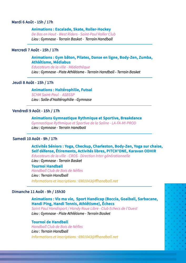 Au programme : animations et initiations gratuites avec plus de 30 disciplines sportives représentées, un large panel de tournois pour petits et grands (badminton, tennis ballon, tchoukball, basket, handball) mais aussi un écran géant pour voir les épreuves des Jeux Olympiques et soutenir nos athlètes français et réunionnais.