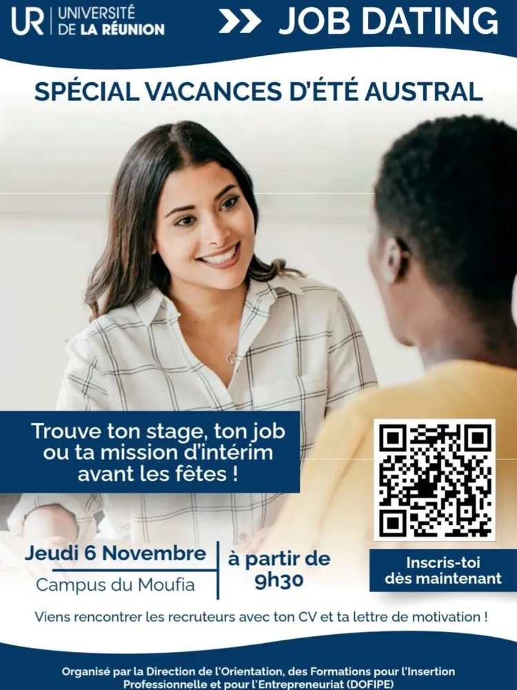 L’Université de La Réunion organise ce jeudi 6 novembre, à partir de 9h30, un Job Dating sur le campus du Moufia. L’événement, porté par la Direction de l’Orientation, des Formations pour l’Insertion Professionnelle et pour l’Entrepreneuriat (DOFIPE), vise à faciliter la rencontre entre étudiants et employeurs à l’approche de la période festive.