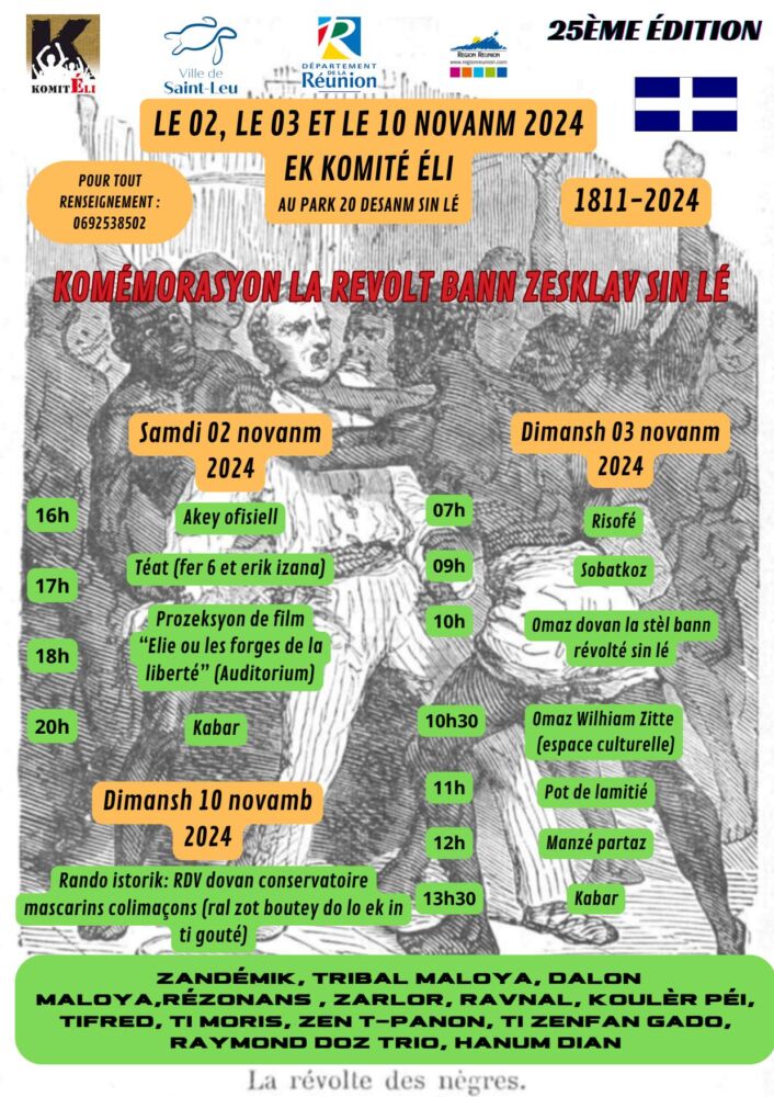 Cette année dans le cadre de sa 25e édition, les journées commémoratives de la révolte des esclaves à Saint-Leu auront lieu le samedi 02, les dimanches 03 et 10 novembre 2024 au Parc 20 Décembre à Saint-Leu.