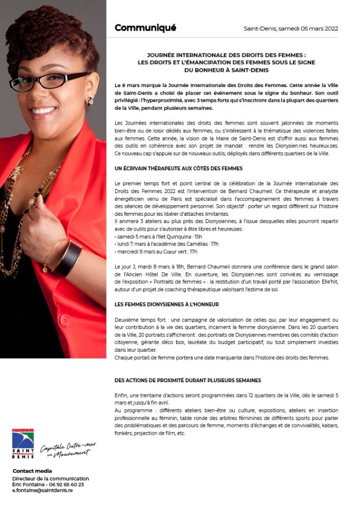Dans le cadre de la Journée Internationale des Droits des Femmes prévue le 8 mars prochain, la Ville de Saint-Denis a choisi cette année, de placer cet événement sous le signe du Bonheur, avec pour objectif : rendre les Dionysien.ne.s heureux.se.s, en s’appuyant sur de nouveaux outils déployés dans les différents quartiers de la Ville.