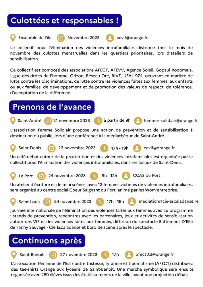 - Saint-Benoît (27 novembre 2023): L’AFECT distribuera des tee-shirts Orange aux lycéens, suivis d’une marche symbolique et d’une projection-débat.