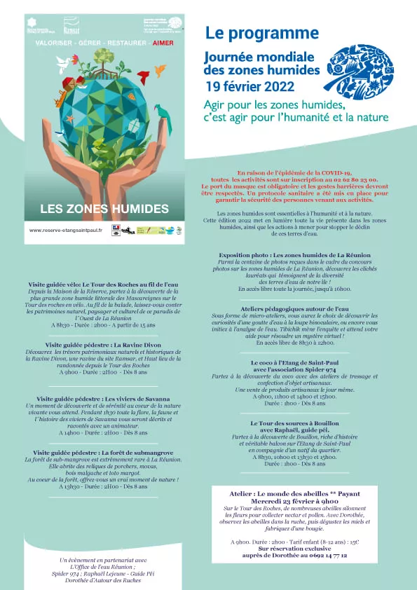 Dans la dynamique de la Journée mondiale des zones humides, lancée à l’échelle mondiale, la Réserve Naturelle Nationale de l’Étang Saint-Paul vous propose une journée d’animations le samedi 19 février 2022. Visites à pied, à vélo, atelier ou encore exposition sont à découvrir tout au long de cette journée.