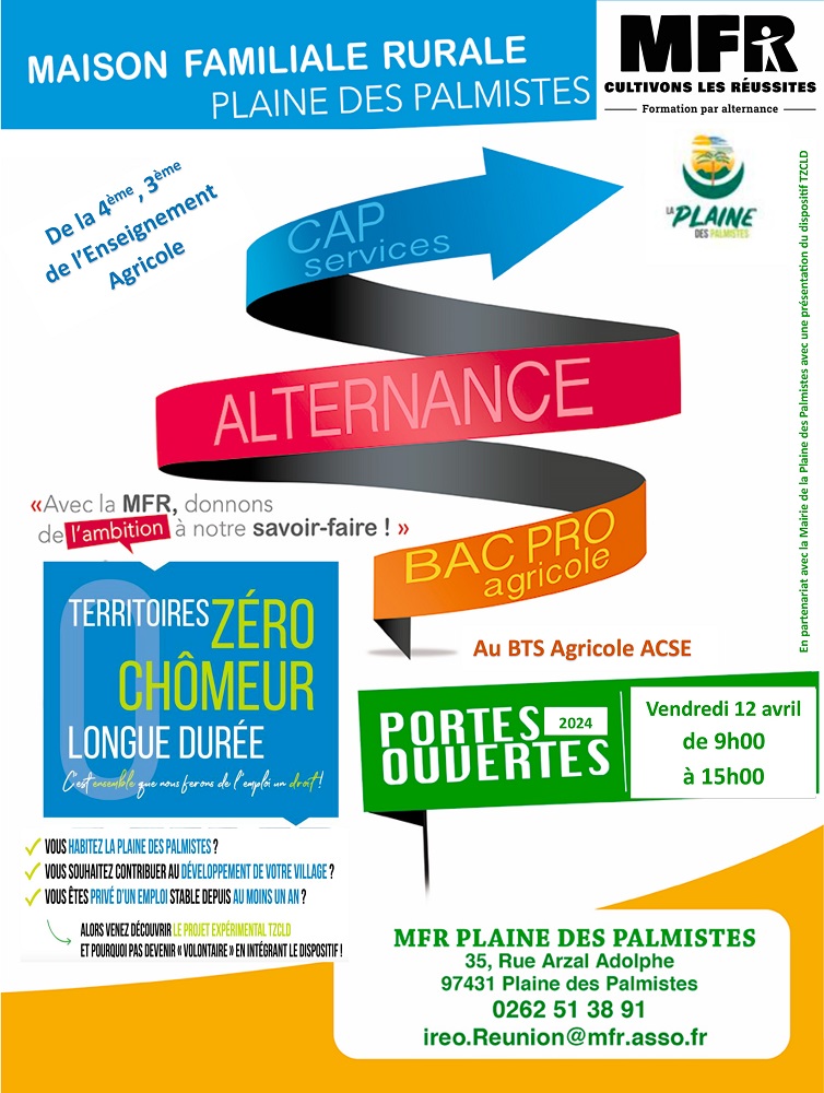 La Maison Familiale et Rurale (MFR) de La Plaine des Palmistes organise une journée portes ouvertes ce vendredi 12 avril 2024 de 9h à 15h, afin de mettre en avant les parcours diplômants et les possibilités d’accueil qu’elle propose.
