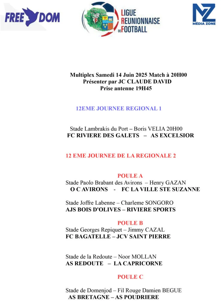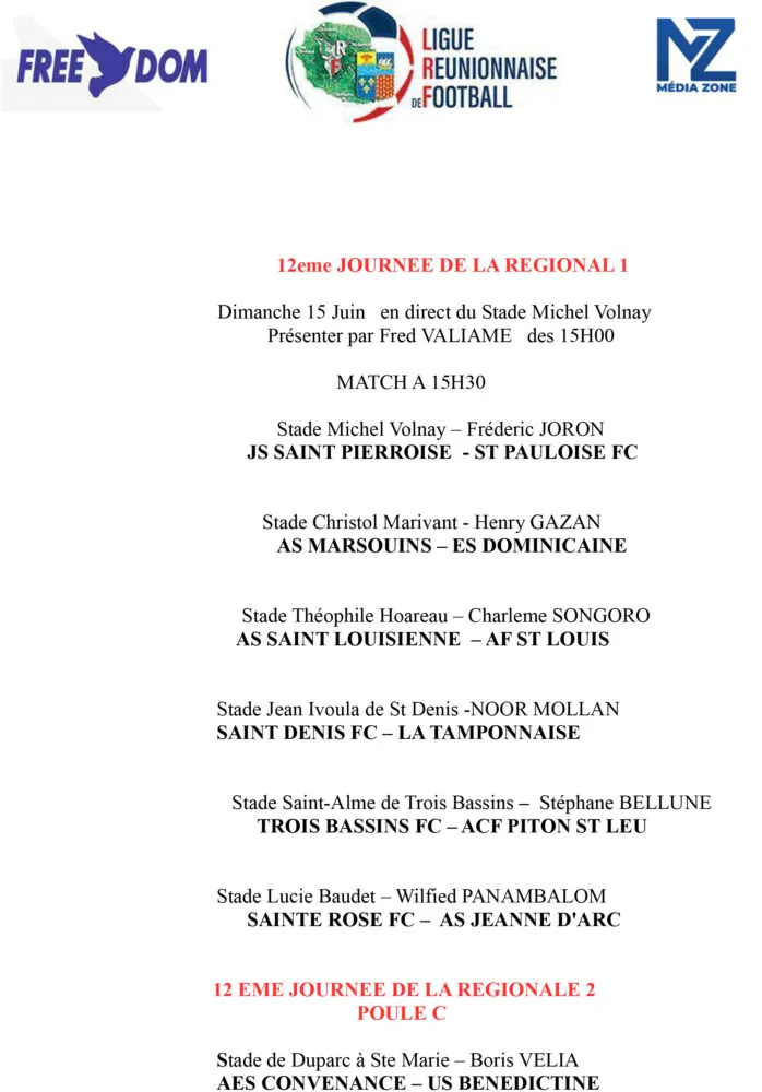 Gros week-end de foot à venir sur les terrains réunionnais ! Avant de se plonger dans la Coupe de La Réunion, place d’abord au championnat avec la 12e journée de Régionale 1 programmée ce samedi et dimanche. Voici le programme complet :