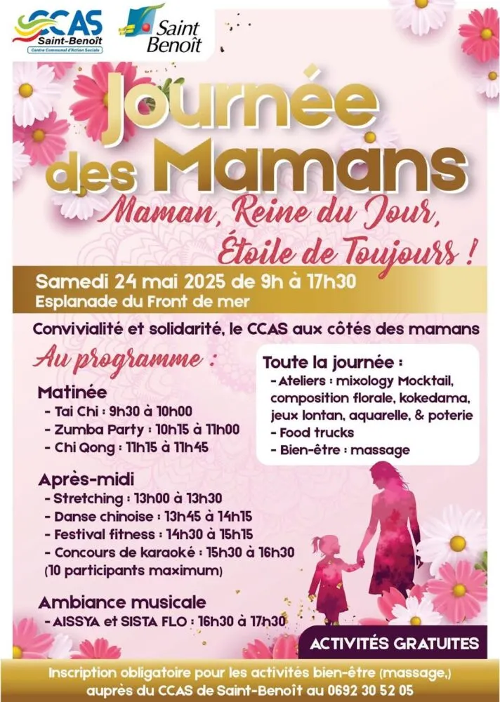 À l’occasion de la Fête des Mères, la ville de Saint-Benoît, en partenariat avec le CCAS, organise une Journée des Mamans le samedi 24 mai 2025, de 9h à 17h30 sur l’esplanade du front de mer.