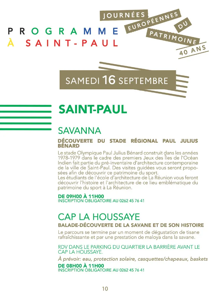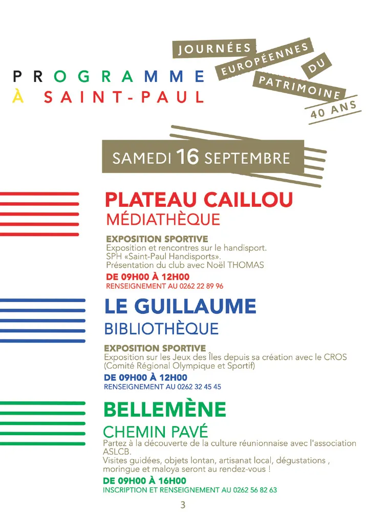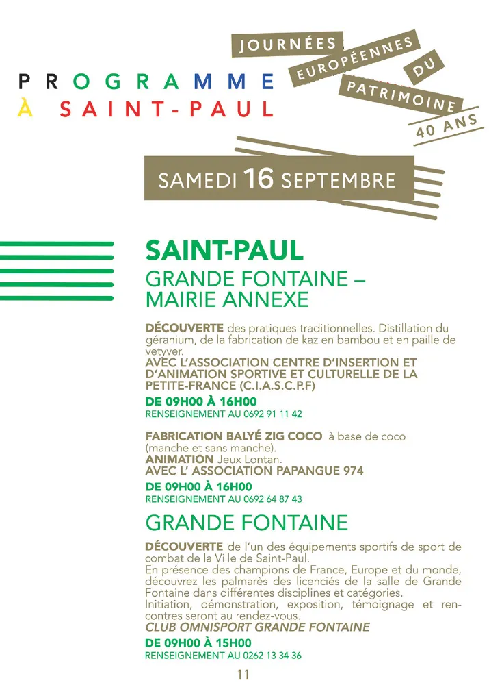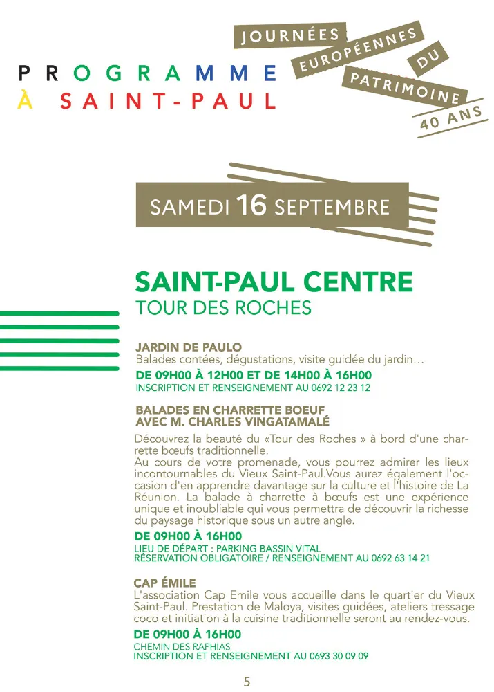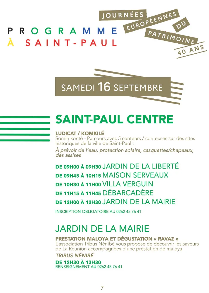 Actualités/Collectivités/Saint-Paul Journées Européennes du Patrimoine 2023 à St-Paul : Découvrez la programmation par Céline Hardelain 12 septembre 2023 1 min de lecture Dans le cadre des Journées Européennes du Patrimoine 2023, voici la programmation complète des événements qui auront lieu à Saint-Paul. Ne manquez pas toute l’actualité de La Réunion ! Abonnez-vous à la newsletter de Free Dom ! Valider Partager Facebook Twitter Pinterest Linkedin Whatsapp Reddit Email Vous pourriez être intéressé par 1 janvier 2026 Jeudi 1ᵉʳ janvier 2026 – Météo, éphéméride et horoscope du jour 31 décembre 2025 Mercredi 31 décembre 2025 – Météo, éphéméride et horoscope du jour 30 décembre 2025 Mardi 30 décembre 2025 – Météo, éphéméride et horoscope du jour Céline Hardelain Laisser un commentaire Annuler la réponseYour email address will not be published. Enregistrer mon nom, mon e-mail et mon site dans le navigateur pour mon prochain commentaire. Current ye@r * Leave this field empty Article précédent CASUD : les premiers vélos électriques en location longue durée disponibles au Tampon Article suivant Inondations à Derna, en Libye : Plus de 2 300 Corps retrouvés, 10 000 disparus le bilan s’alourdit Articles récents... Jeudi 1ᵉʳ janvier 2026 – Météo, éphéméride et horoscope du jour Mercredi 31 décembre 2025 – Météo, éphéméride et horoscope du jour Hommage à Johnny Hallyday sur Free Dom 2 ce 5 décembre Mardi 30 décembre 2025 – Météo, éphéméride et horoscope du jour Saint-Joseph : découverte de 2337 plants de cannabis, arrestation de 2 individus Point sur le réseau routier départemental, 29 décembre à 16H30 Suicide sur le pont de la Rivière d’Abord : importante mobilisation des secours et des forces de l’ordre Radier submergé à Ilet Furcy : la route de Cilaos fermée à la circulation cette nuit Fortes pluies : appel à la plus grande prudence à Saint-Paul Saint-Gilles-les-Bains : une route impraticable, les riverains montent au créneau (VIDEOS)
