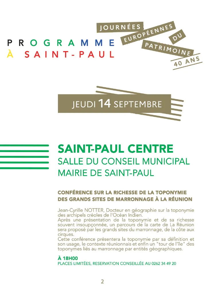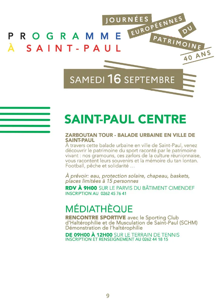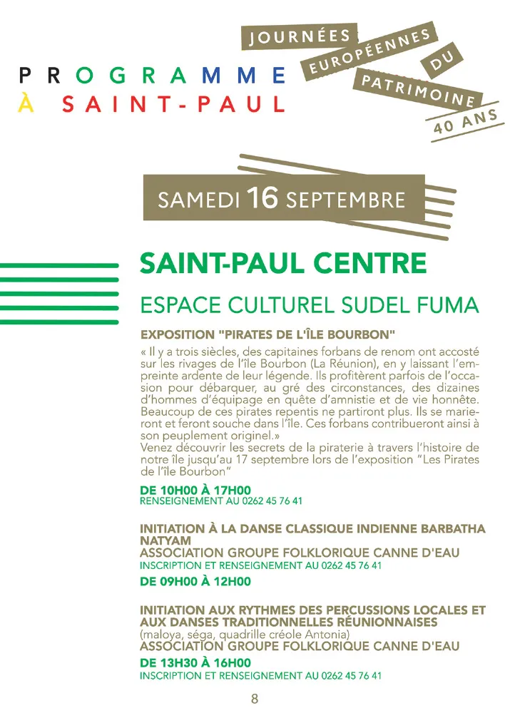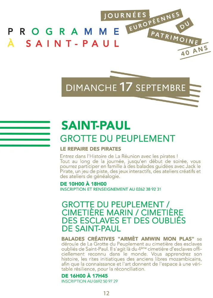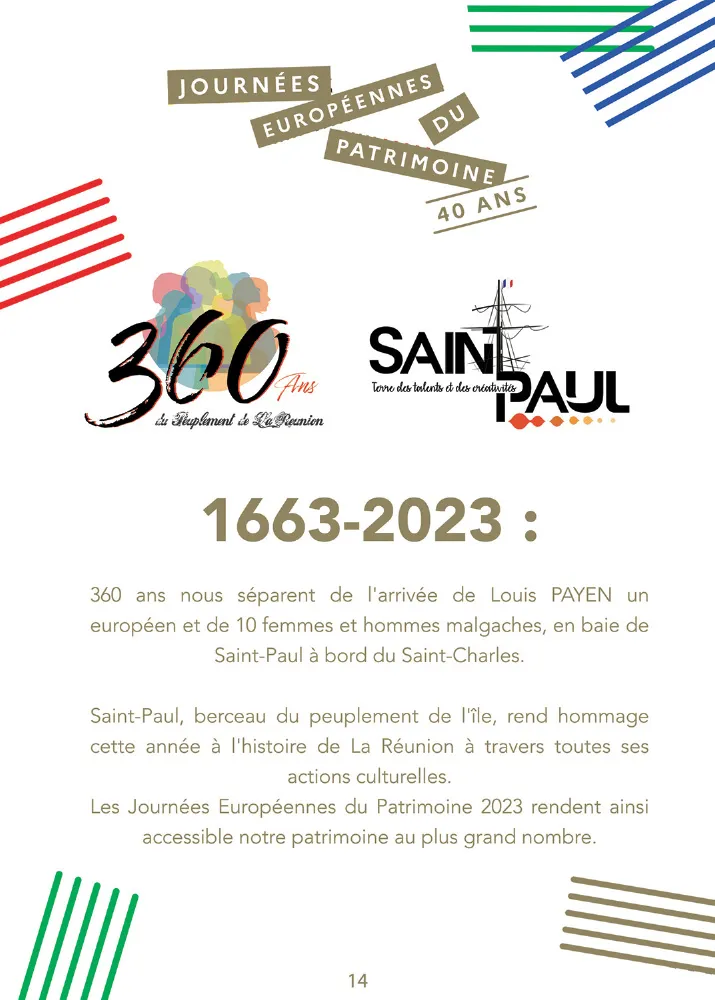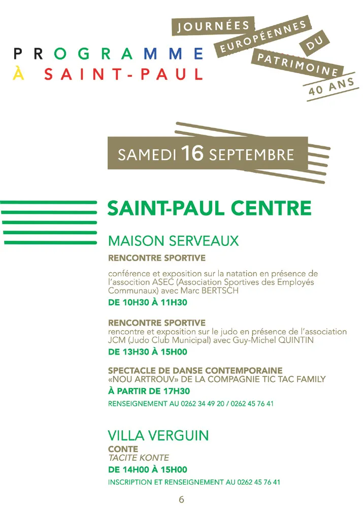 Actualités/Collectivités/Saint-Paul Journées Européennes du Patrimoine 2023 à St-Paul : Découvrez la programmation par Céline Hardelain 12 septembre 2023 1 min de lecture Dans le cadre des Journées Européennes du Patrimoine 2023, voici la programmation complète des événements qui auront lieu à Saint-Paul. Ne manquez pas toute l’actualité de La Réunion ! Abonnez-vous à la newsletter de Free Dom ! Valider Partager Facebook Twitter Pinterest Linkedin Whatsapp Reddit Email Vous pourriez être intéressé par 1 janvier 2026 Jeudi 1ᵉʳ janvier 2026 – Météo, éphéméride et horoscope du jour 31 décembre 2025 Mercredi 31 décembre 2025 – Météo, éphéméride et horoscope du jour 30 décembre 2025 Mardi 30 décembre 2025 – Météo, éphéméride et horoscope du jour Céline Hardelain Laisser un commentaire Annuler la réponseYour email address will not be published. Enregistrer mon nom, mon e-mail et mon site dans le navigateur pour mon prochain commentaire. Current ye@r * Leave this field empty Article précédent CASUD : les premiers vélos électriques en location longue durée disponibles au Tampon Article suivant Inondations à Derna, en Libye : Plus de 2 300 Corps retrouvés, 10 000 disparus le bilan s’alourdit Articles récents... Jeudi 1ᵉʳ janvier 2026 – Météo, éphéméride et horoscope du jour Mercredi 31 décembre 2025 – Météo, éphéméride et horoscope du jour Hommage à Johnny Hallyday sur Free Dom 2 ce 5 décembre Mardi 30 décembre 2025 – Météo, éphéméride et horoscope du jour Saint-Joseph : découverte de 2337 plants de cannabis, arrestation de 2 individus Point sur le réseau routier départemental, 29 décembre à 16H30 Suicide sur le pont de la Rivière d’Abord : importante mobilisation des secours et des forces de l’ordre Radier submergé à Ilet Furcy : la route de Cilaos fermée à la circulation cette nuit Fortes pluies : appel à la plus grande prudence à Saint-Paul Saint-Gilles-les-Bains : une route impraticable, les riverains montent au créneau (VIDEOS)
