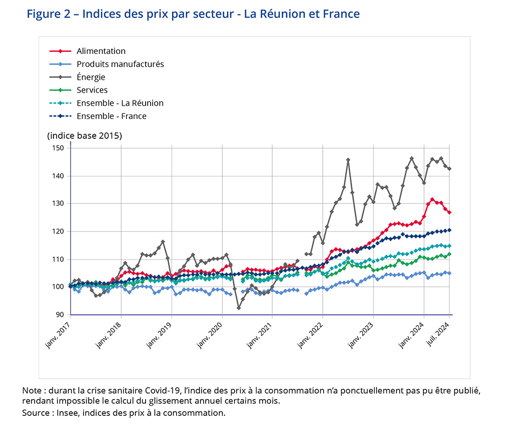 En juillet 2024, l’indice des prix à la consommation est stable à La Réunion, après une baisse de 0,4 % en juin. Les prix des services repartent à la hausse, ceux des produits manufacturés sont stables, ceux de l’alimentation et de l’énergie reculent de nouveau.