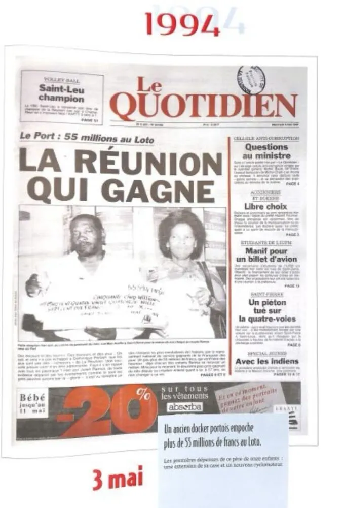 C’était le 3 mai 1994, au lendemain d’un tirage du Loto qui allait entrer dans l’histoire réunionnaise. La une du Quotidien affichait en lettres capitales : « LA RÉUNION QUI GAGNE ». Sur la photo, Julien Ramsa, docker du Port, posait avec un chèque vertigineux : 55 millions de francs, soit près de 9 millions d’euros actuels, le plus gros gain enregistré dans l’île et l’un des records français de l’époque.