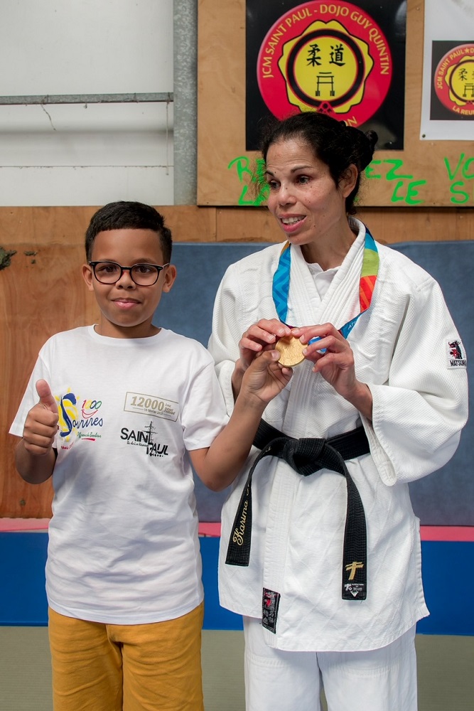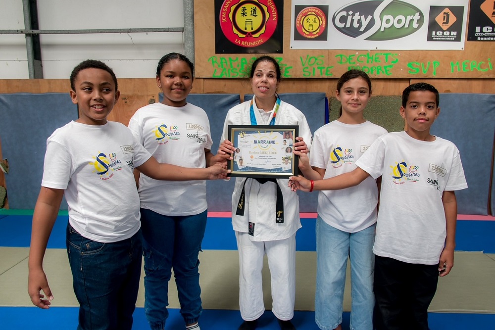 Deux jours après une rencontre très inspirante pour les jeunes dionysiens au dojo régional, la championne paralympique Karima Medjeded a été la marraine de la 310e opération de l’Association 1000 Sourires. L’événement, orchestré par le président-fondateur Ibrahim Ingar, s’est déroulé ce vendredi au dojo Guy Quintin de Plateau-Caillou avec la participation d’une quarantaine d’élèves de CM1-CM2 de l’école primaire Adèle Ferrand de Saint-Paul. « Les enfants ont vécu une matinée de rêve », s’est délecté Jean-Pierre Ligdamis, directeur de l’établissement scolaire de Plateau Caillou, entouré de deux de ses professeurs des écoles sur le tatami. « C’est un incroyable cadeau que nos élèves reçoivent avec 1000 Sourires. C’est une chance de pouvoir approcher une si grande championne et de toucher sa médaille d’or. »