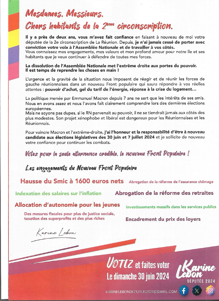 Karine Lebon a, quant à elle, souligné que « le Nouveau Front populaire est la seule force capable d’incarner une véritable alternance ». Elle a rappelé que lors des élections législatives de 2022, « les Réunionnais avaient déjà envoyé un signal clair à Emmanuel Macron. Élue avec Perceval Gaillard, elle a déposé sept propositions de loi, se plaçant ainsi parmi « les députés les plus actifs ».