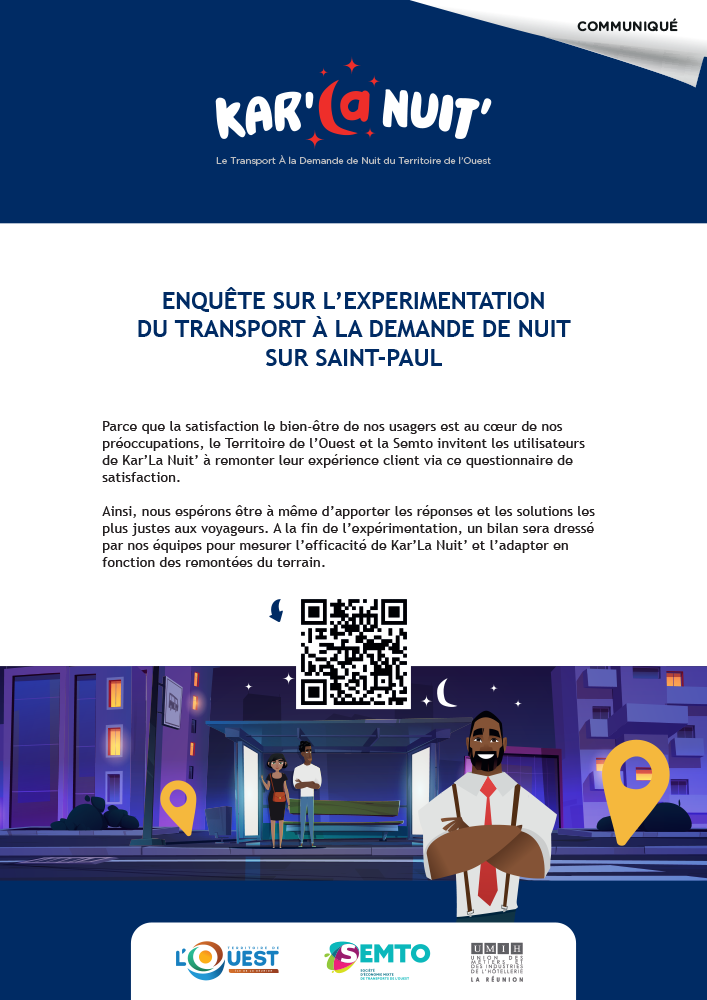 Afin d’assurer une expérience utilisateur optimale, le Territoire de l’Ouest et la Semto encouragent les utilisateurs de « Kar’La Nuit’ » à partager leurs commentaires et suggestions en participant à une enquête de satisfaction accessible via un QR code. Cette démarche permettra aux autorités de recueillir des données précieuses pour adapter et améliorer le service en fonction des besoins et des attentes de la communauté.
