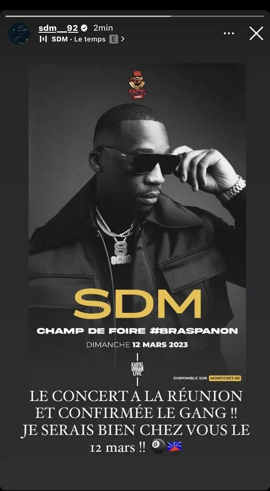 Musique Péï Kartel Urban Live 4 : SDM confirme sa présence pour un show à Bras Panon le 12 mars prochain par Céline Hardelain 22 janvier 2023 1 min de lecture 1 Le célèbre rappeur français SDM a confirmé en story Instagram qu’il serait présent le 12 mars prochain à Bras Panon pour assurer un show exclusif à La Réunion lors du Kartel Urban Live 4. Ne manquez pas toute l’actualité de La Réunion ! Abonnez-vous à la newsletter de Free Dom ! Valider Partager Facebook Twitter Pinterest Linkedin Whatsapp Reddit Email Catégorie: Kartel Urban Live 4SDM Vous pourriez être intéressé par 21 décembre 2025 Musique : quand Louïz transforme ses blessures en mémoire créole 15 novembre 2025 Plus qu’une chanson : Keïla révèle « Maladie », le cri du cœur d’une génération face au diabète ! (Photos-Vidéo) 15 octobre 2025 Clif Azor fête ses 20 ans de carrière ce week-end à Lyon Céline Hardelain 1 Commentaire assez faire honte l île de la réunion Répondre Signaler un commentaire Laisser un commentaire Annuler la réponseYour email address will not be published. Enregistrer mon nom, mon e-mail et mon site dans le navigateur pour mon prochain commentaire. Current ye@r * Leave this field empty Article précédent 5è édition du « Concours Voix des Outre-mer » Article suivant Le chanteur réunionnais Daniel Refitaha décède à 68 ans Articles récents... Mercredi 31 décembre 2025 – Météo, éphéméride et horoscope du jour Hommage à Johnny Hallyday sur Free Dom 2 ce 5 décembre Mardi 30 décembre 2025 – Météo, éphéméride et horoscope du jour Saint-Joseph : découverte de 2337 plants de cannabis, arrestation de 2 individus Point sur le réseau routier départemental, 29 décembre à 16H30 Suicide sur le pont de la Rivière d’Abord : importante mobilisation des secours et des forces de l’ordre Radier submergé à Ilet Furcy : la route de Cilaos fermée à la circulation cette nuit Fortes pluies : appel à la plus grande prudence à Saint-Paul Saint-Gilles-les-Bains : une route impraticable, les riverains montent au créneau (VIDEOS) Très grands excès de vitesse : un délit passible de prison depuis le 29 décembre 2025