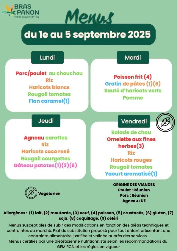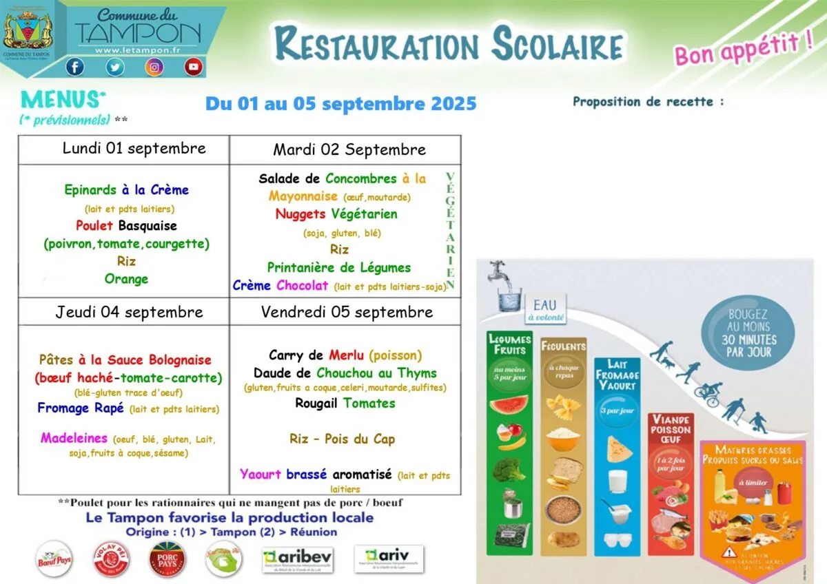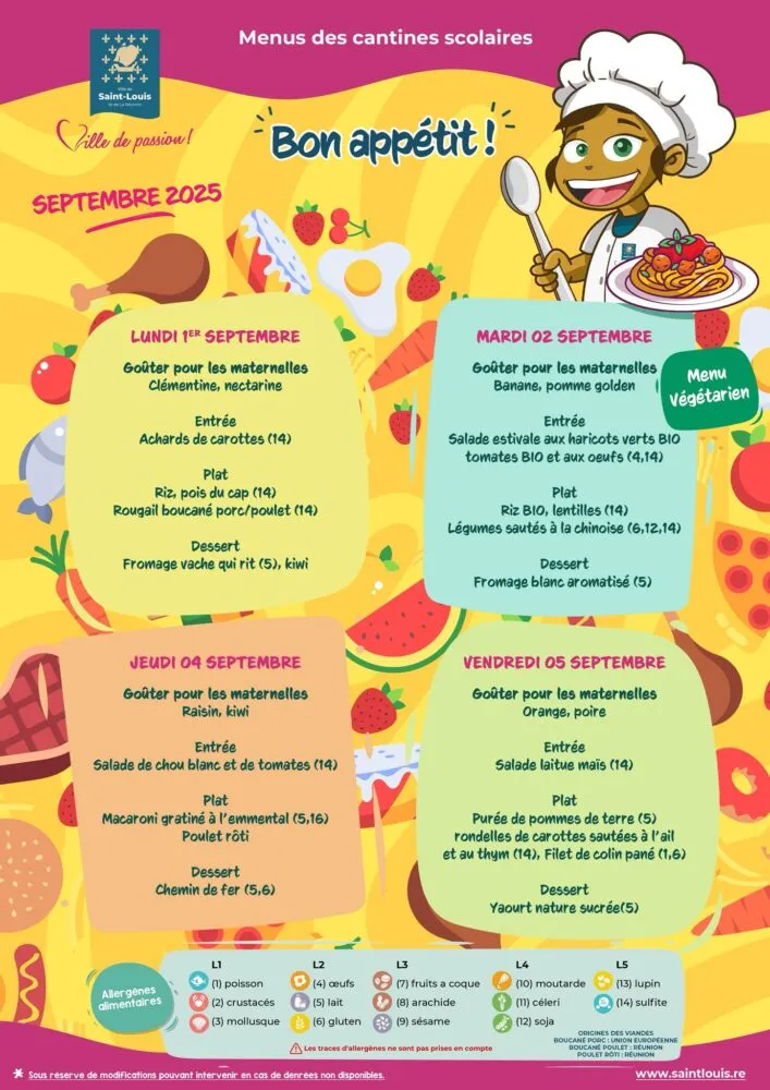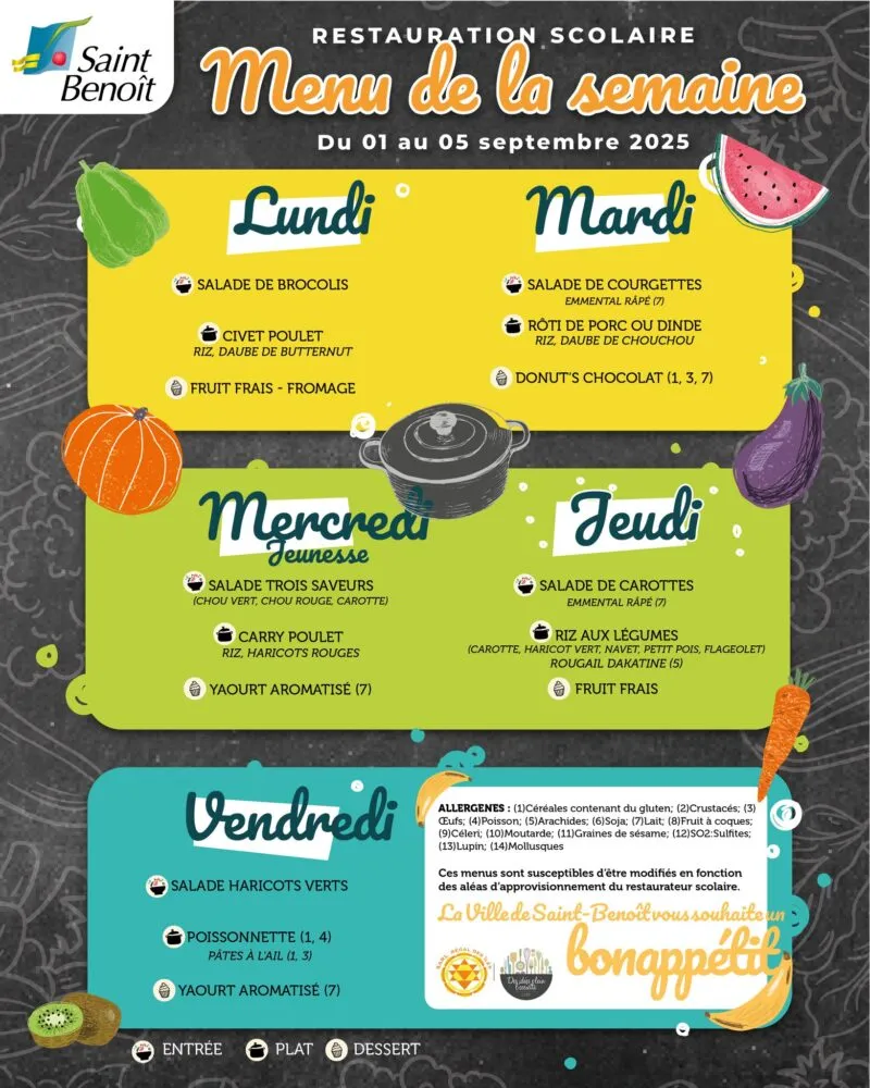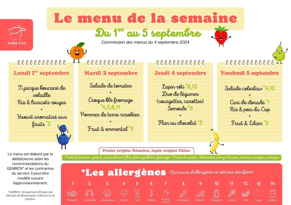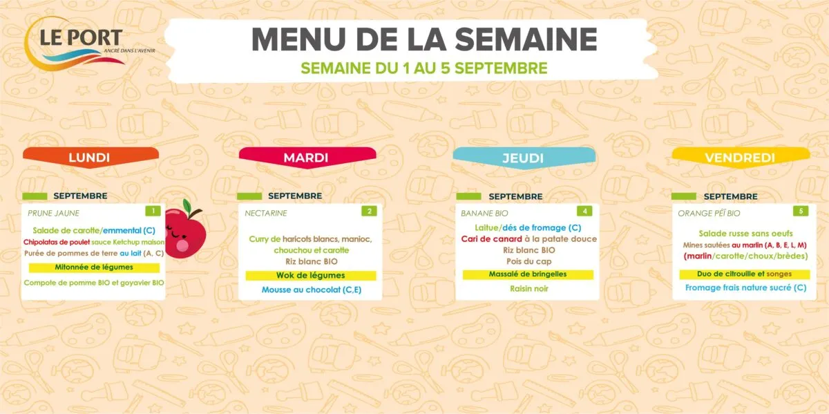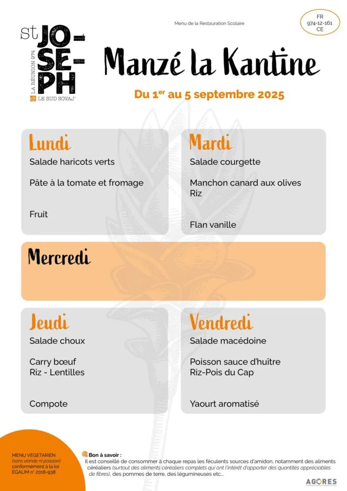 Kossa i manze à la cantine cette semaine ? Découvrez les menus pour nos marmailles du 1 au 5 septembre.