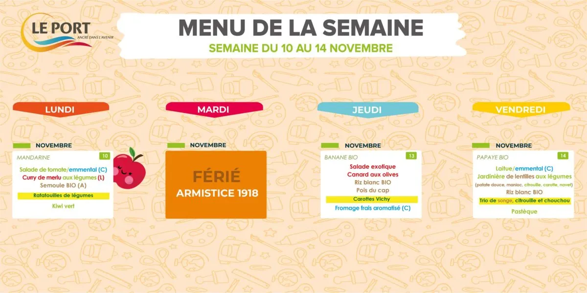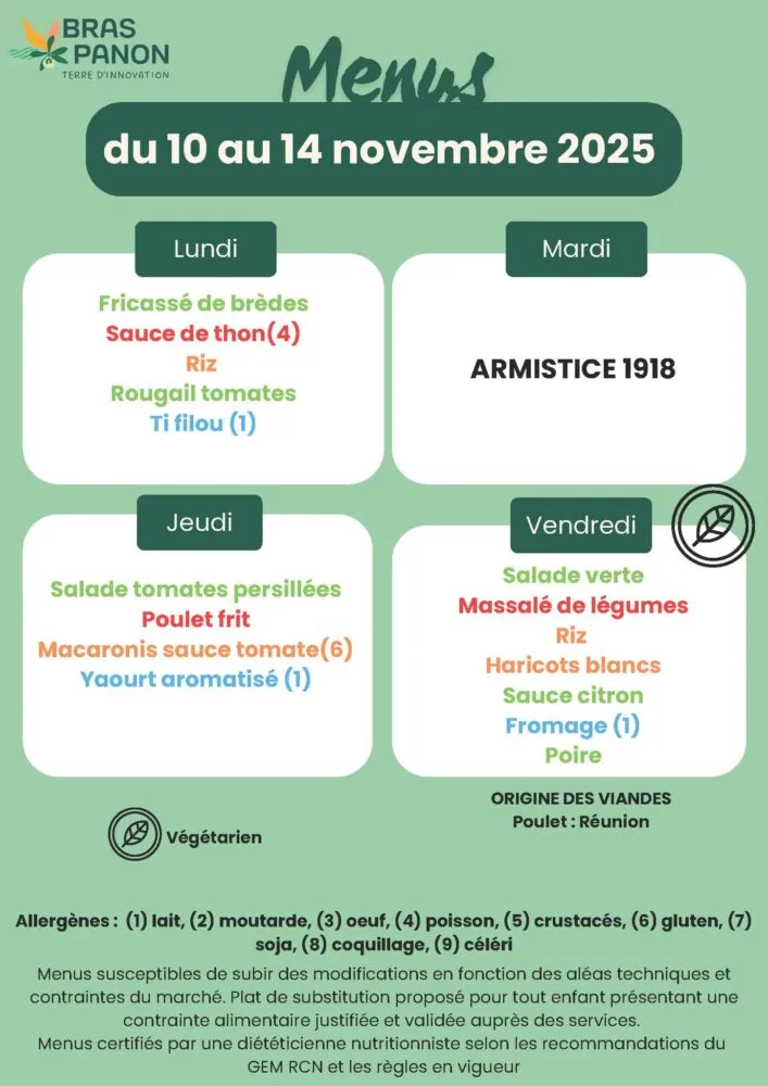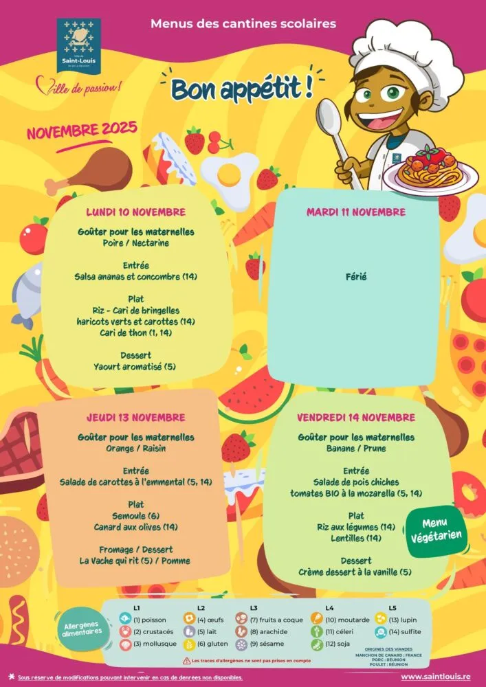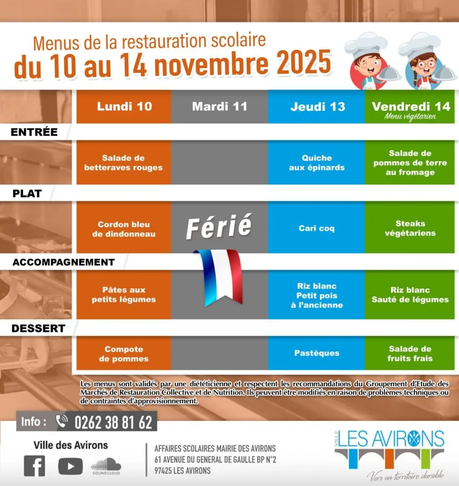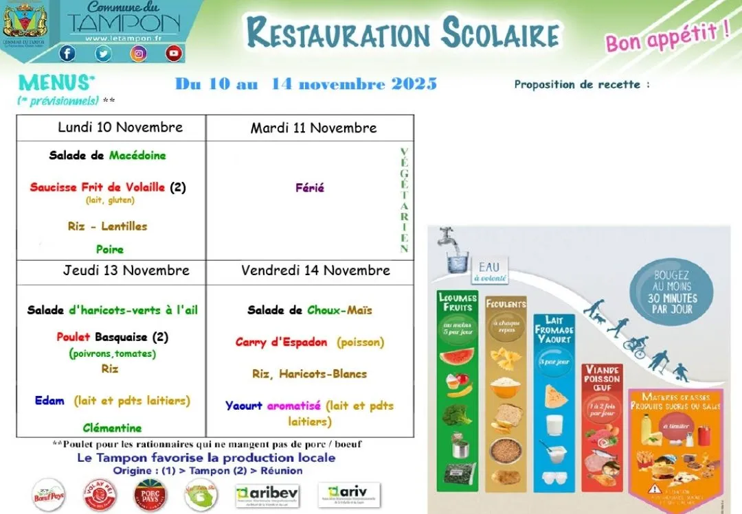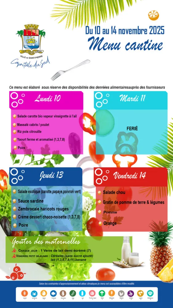 Actualités Kossa i manze à la cantine cette semaine du 10 au 14 novembre par Céline Hardelain 10 novembre 2025 1 min de lecture Kossa i manze à la cantine cette semaine ? Découvrez les menus pour nos marmailles du 10 au 14 novembre. Saint-Benoit Les Avirons Le Tampon Etang-Salé Le Port Sainte-Rose Saint-Paul Bras-Panon Saint-Pierre Saint-Louis Ne manquez pas toute l’actualité de La Réunion ! Abonnez-vous à la newsletter de Free Dom ! Valider Partager Facebook Twitter Pinterest Linkedin Whatsapp Reddit Email Vous pourriez être intéressé par 31 décembre 2025 Mercredi 31 décembre 2025 – Météo, éphéméride et horoscope du jour 30 décembre 2025 Mardi 30 décembre 2025 – Météo, éphéméride et horoscope du jour 29 décembre 2025 Saint-Joseph : découverte de 2337 plants de cannabis, arrestation de 2 individus Céline Hardelain Laisser un commentaire Annuler la réponseYour email address will not be published. Enregistrer mon nom, mon e-mail et mon site dans le navigateur pour mon prochain commentaire. Current ye@r * Leave this field empty Article précédent ODYSSEA Réunion 2025 : retrouvez les images de la vague rose avec Prisca (Podcast-photos-vidéos) Article suivant Cilaos commémore l’histoire des Enfants de la Creuse le 20 novembre Articles récents... Mercredi 31 décembre 2025 – Météo, éphéméride et horoscope du jour Hommage à Johnny Hallyday sur Free Dom 2 ce 5 décembre Mardi 30 décembre 2025 – Météo, éphéméride et horoscope du jour Saint-Joseph : découverte de 2337 plants de cannabis, arrestation de 2 individus Point sur le réseau routier départemental, 29 décembre à 16H30 Suicide sur le pont de la Rivière d’Abord : importante mobilisation des secours et des forces de l’ordre Radier submergé à Ilet Furcy : la route de Cilaos fermée à la circulation cette nuit Fortes pluies : appel à la plus grande prudence à Saint-Paul Saint-Gilles-les-Bains : une route impraticable, les riverains montent au créneau (VIDEOS) Très grands excès de vitesse : un délit passible de prison depuis le 29 décembre 2025
