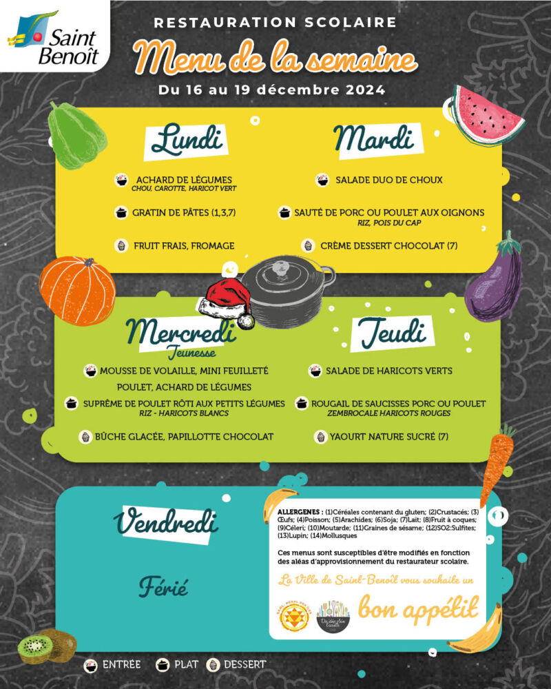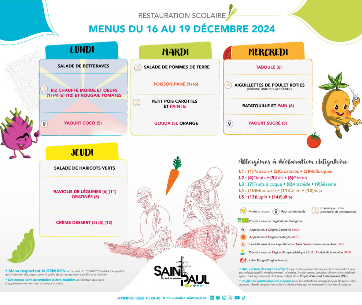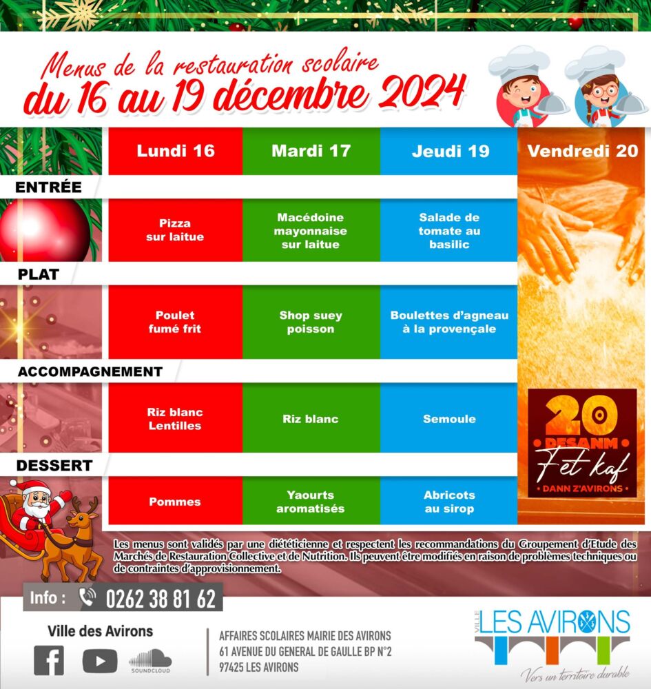 Actualités Kossa i manze à la cantine cette semaine du 16 au 19 décembre par Céline Hardelain 16 décembre 2024 1 min de lecture Les menus de la restauration scolaire du lundi 16 au jeudi 19 décembre. Les Avirons Saint-Benoit Saint-Paul Sainte-Rose Saint-Pierre Le Port Le Tampon Ne manquez pas toute l’actualité de La Réunion ! Abonnez-vous à la newsletter de Free Dom ! Valider Partager Facebook Twitter Pinterest Linkedin Whatsapp Reddit Email Vous pourriez être intéressé par 31 décembre 2025 Mercredi 31 décembre 2025 – Météo, éphéméride et horoscope du jour 30 décembre 2025 Mardi 30 décembre 2025 – Météo, éphéméride et horoscope du jour 29 décembre 2025 Saint-Joseph : découverte de 2337 plants de cannabis, arrestation de 2 individus Céline Hardelain Laisser un commentaire Annuler la réponseYour email address will not be published. Enregistrer mon nom, mon e-mail et mon site dans le navigateur pour mon prochain commentaire. Current ye@r * Leave this field empty Article précédent Saint-Joseph : retour sur le tout premier championnat de La Réunion de Street Lifting (Vidéo-Photos) Article suivant Lamba : une étoffe, une histoire, une culture – Exposition à la Villa de la Région Articles récents... Mercredi 31 décembre 2025 – Météo, éphéméride et horoscope du jour Hommage à Johnny Hallyday sur Free Dom 2 ce 5 décembre Mardi 30 décembre 2025 – Météo, éphéméride et horoscope du jour Saint-Joseph : découverte de 2337 plants de cannabis, arrestation de 2 individus Point sur le réseau routier départemental, 29 décembre à 16H30 Suicide sur le pont de la Rivière d’Abord : importante mobilisation des secours et des forces de l’ordre Radier submergé à Ilet Furcy : la route de Cilaos fermée à la circulation cette nuit Fortes pluies : appel à la plus grande prudence à Saint-Paul Saint-Gilles-les-Bains : une route impraticable, les riverains montent au créneau (VIDEOS) Très grands excès de vitesse : un délit passible de prison depuis le 29 décembre 2025