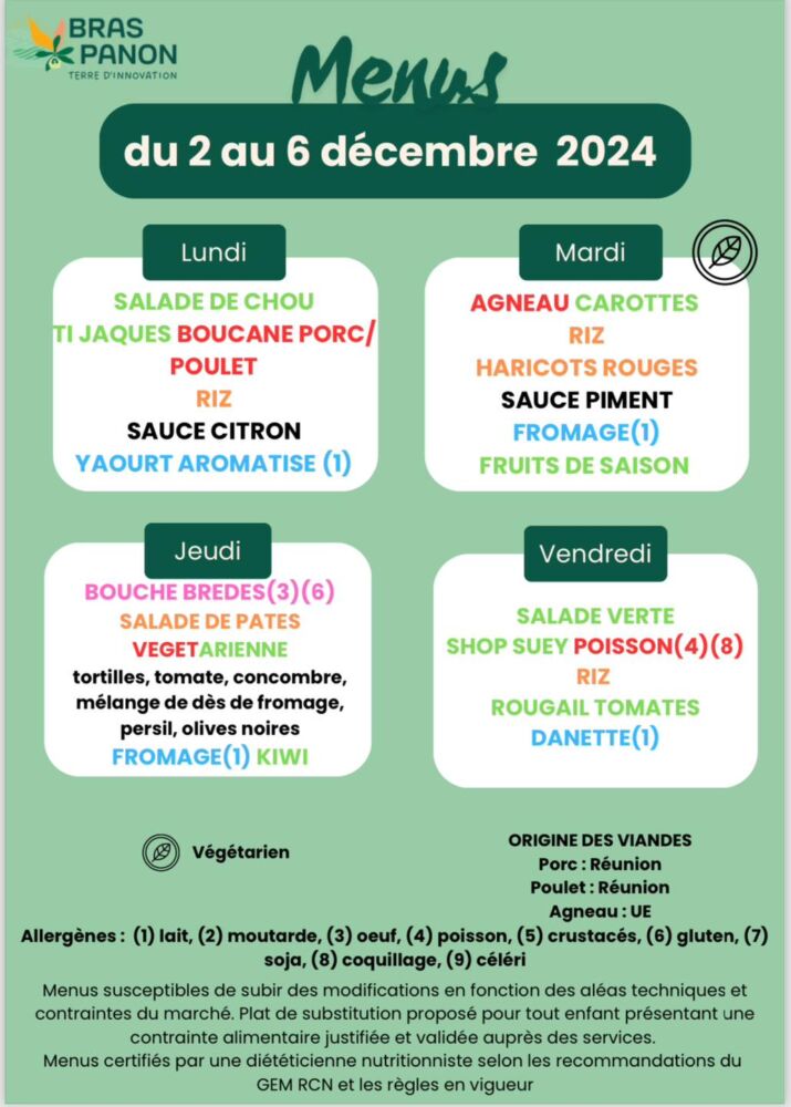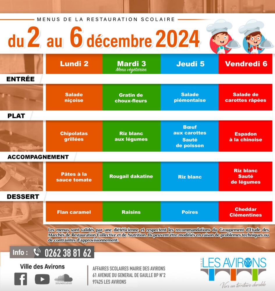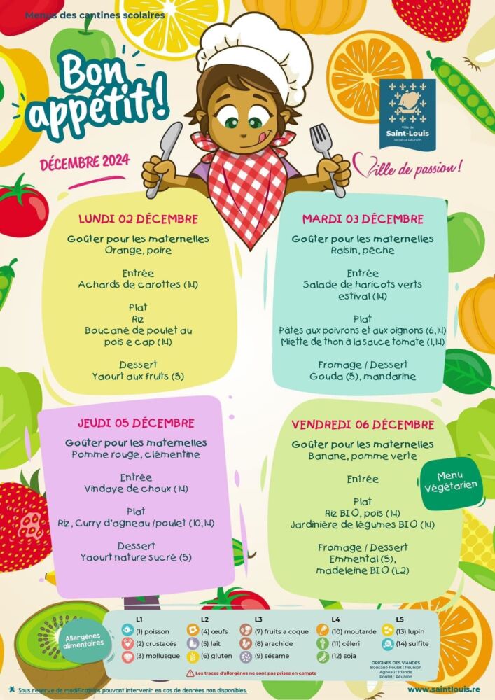 Les menus de la restauration scolaire du lundi 2 au 6 décembre.