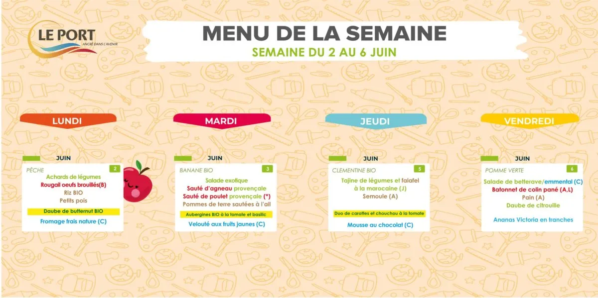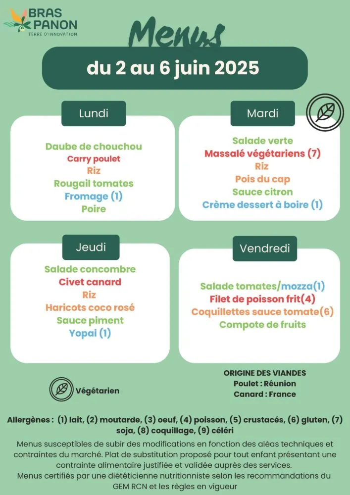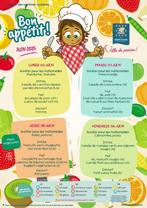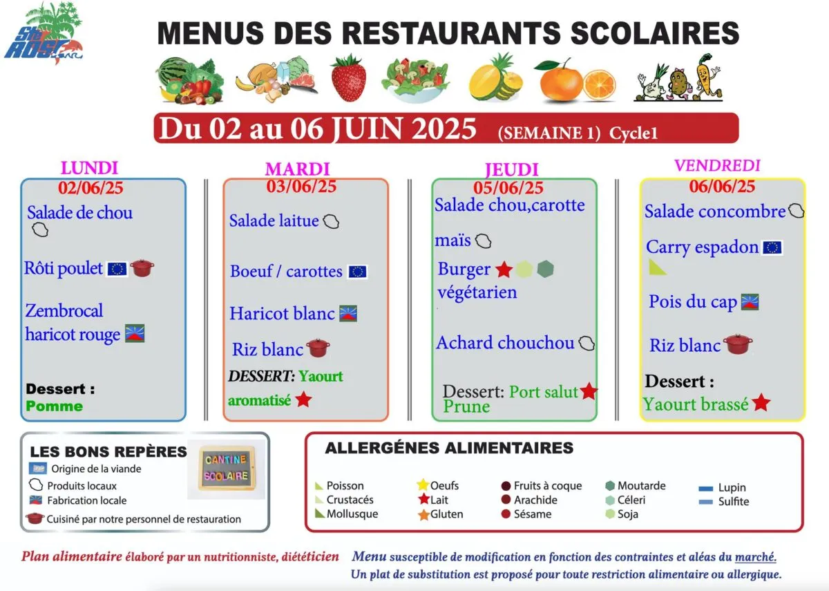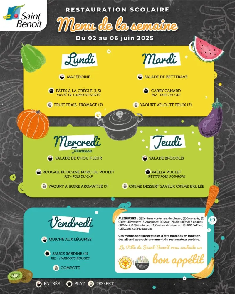 Actualités Kossa i manze à la cantine cette semaine du 2 au 6 juin par Céline Hardelain 2 juin 2025 1 min de lecture Kossa i manze à la cantine cette semaine ? Découvrez les menus pour nos marmailles du 2 au 6 juin. Saint-Louis Etang-Salé Le Port Saint-Paul Saint-Benoit Bras-Panon Sainte-Rose Ne manquez pas toute l’actualité de La Réunion ! Abonnez-vous à la newsletter de Free Dom ! Valider Partager Facebook Twitter Pinterest Linkedin Whatsapp Reddit Email Vous pourriez être intéressé par 1 janvier 2026 Jeudi 1ᵉʳ janvier 2026 – Météo, éphéméride et horoscope du jour 31 décembre 2025 Mercredi 31 décembre 2025 – Météo, éphéméride et horoscope du jour 30 décembre 2025 Mardi 30 décembre 2025 – Météo, éphéméride et horoscope du jour Céline Hardelain Laisser un commentaire Annuler la réponseYour email address will not be published. Enregistrer mon nom, mon e-mail et mon site dans le navigateur pour mon prochain commentaire. Current ye@r * Leave this field empty Article précédent Plus de 280 infractions en deux jours : les routes sous haute surveillance Article suivant « Des tambours troublent la tranquillité aux Makes » (Podcast) Articles récents... Jeudi 1ᵉʳ janvier 2026 – Météo, éphéméride et horoscope du jour Mercredi 31 décembre 2025 – Météo, éphéméride et horoscope du jour Hommage à Johnny Hallyday sur Free Dom 2 ce 5 décembre Mardi 30 décembre 2025 – Météo, éphéméride et horoscope du jour Saint-Joseph : découverte de 2337 plants de cannabis, arrestation de 2 individus Point sur le réseau routier départemental, 29 décembre à 16H30 Suicide sur le pont de la Rivière d’Abord : importante mobilisation des secours et des forces de l’ordre Radier submergé à Ilet Furcy : la route de Cilaos fermée à la circulation cette nuit Fortes pluies : appel à la plus grande prudence à Saint-Paul Saint-Gilles-les-Bains : une route impraticable, les riverains montent au créneau (VIDEOS)
