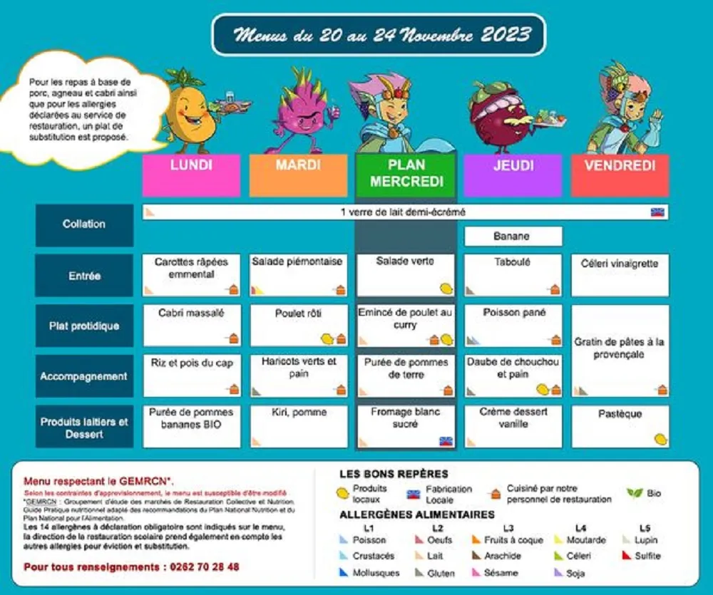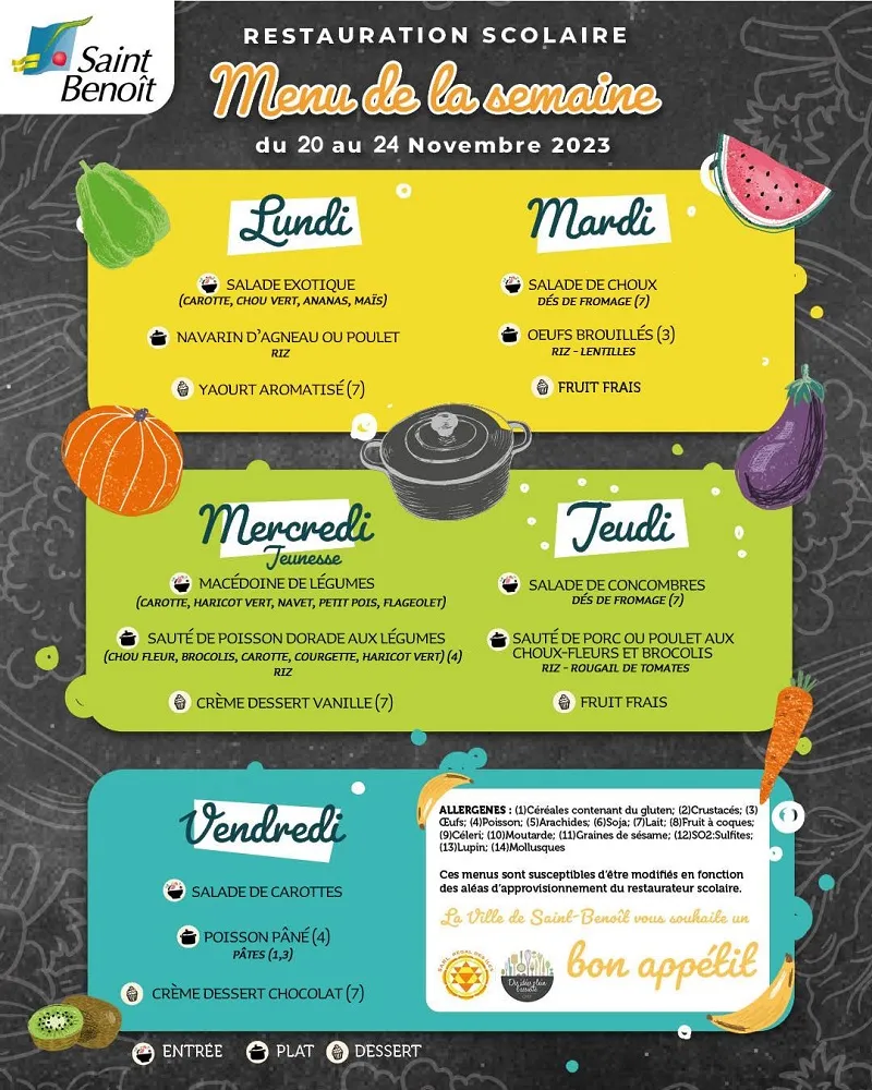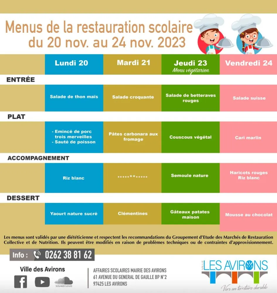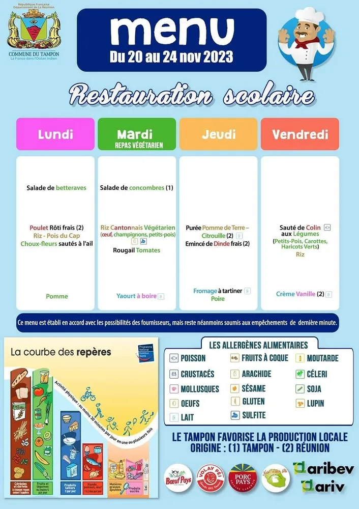 Actualités Kossa i manze à la cantine cette semaine du 20 au 24 novembre par Céline Hardelain 20 novembre 2023 1 min de lecture Les menus de la restauration scolaire du lundi 20 au vendredi 24 novembre. Le Tampon Les Avirons Saint-Benoit Saint-Paul L’Etang-Salé Ne manquez pas toute l’actualité de La Réunion ! Abonnez-vous à la newsletter de Free Dom ! Valider Partager Facebook Twitter Pinterest Linkedin Whatsapp Reddit Email Vous pourriez être intéressé par 2 janvier 2026 1 janvier 2026 Jeudi 1ᵉʳ janvier 2026 – Météo, éphéméride et horoscope du jour 31 décembre 2025 Mercredi 31 décembre 2025 – Météo, éphéméride et horoscope du jour Céline Hardelain Laisser un commentaire Annuler la réponseYour email address will not be published. Enregistrer mon nom, mon e-mail et mon site dans le navigateur pour mon prochain commentaire. Current ye@r * Leave this field empty Article précédent Extinction Rebellion Réunion découpe un panneau publicitaire pour interpeller les élus de St-Paul Article suivant Concert de Polyphonia Orchestre en soutien au CHOR pour son projet de la Maison des Femmes et de l’Enfant Articles récents... Jeudi 1ᵉʳ janvier 2026 – Météo, éphéméride et horoscope du jour Mercredi 31 décembre 2025 – Météo, éphéméride et horoscope du jour Hommage à Johnny Hallyday sur Free Dom 2 ce 5 décembre Mardi 30 décembre 2025 – Météo, éphéméride et horoscope du jour Saint-Joseph : découverte de 2337 plants de cannabis, arrestation de 2 individus Point sur le réseau routier départemental, 29 décembre à 16H30 Suicide sur le pont de la Rivière d’Abord : importante mobilisation des secours et des forces de l’ordre Radier submergé à Ilet Furcy : la route de Cilaos fermée à la circulation cette nuit Fortes pluies : appel à la plus grande prudence à Saint-Paul
