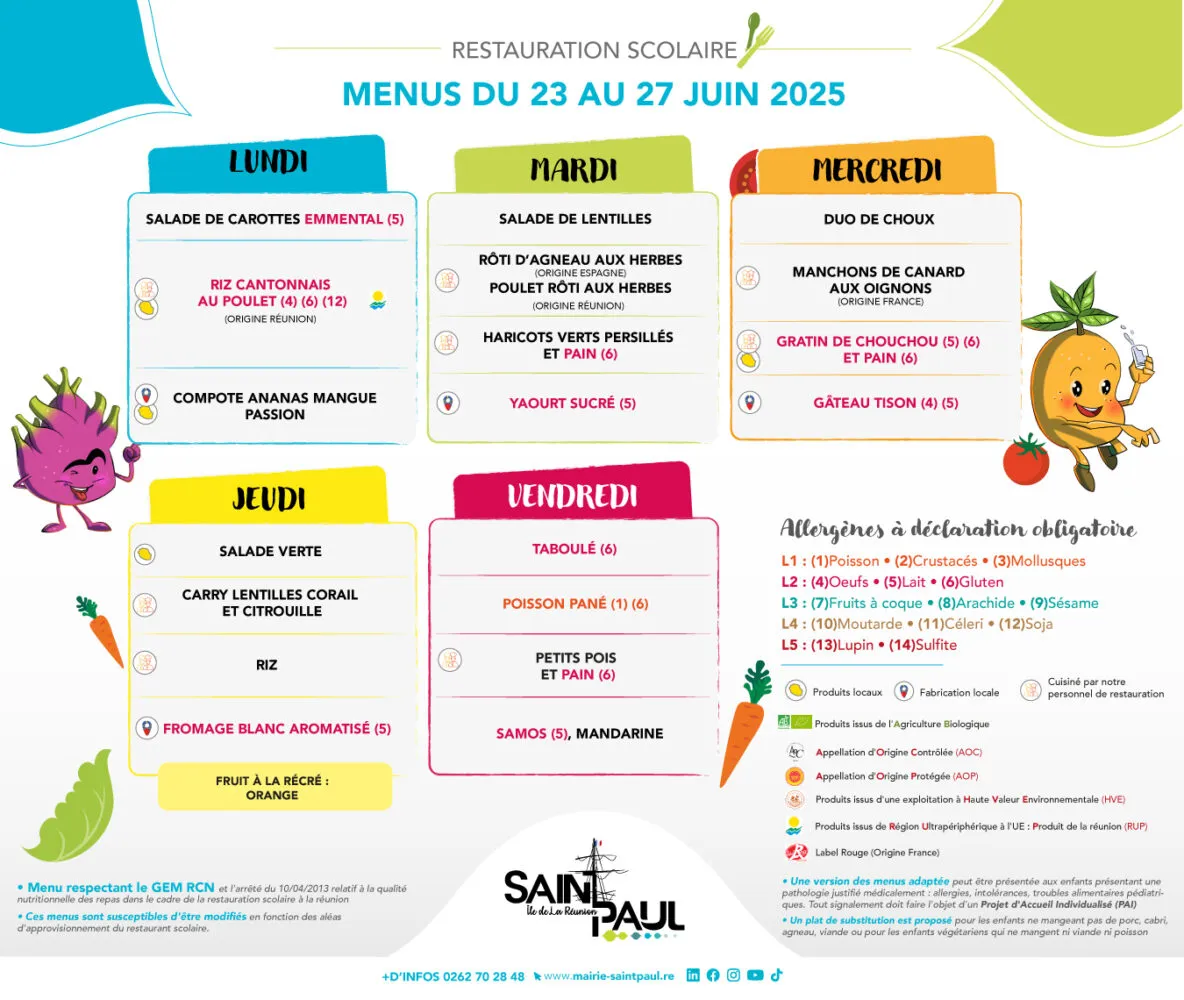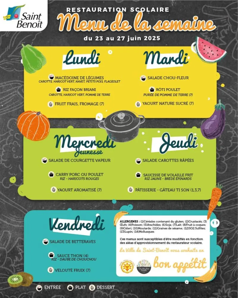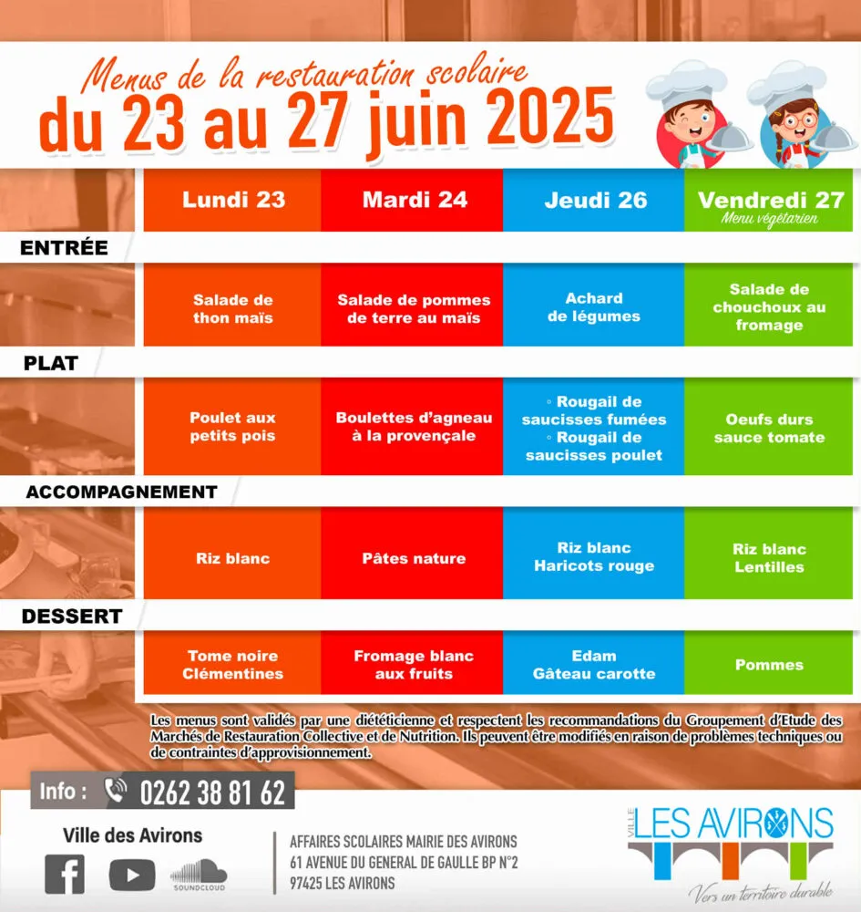Actualités Kossa i manze à la cantine cette semaine du 23 au 27 juin par Céline Hardelain 23 juin 2025 1 min de lecture Kossa i manze à la cantine cette semaine ? Découvrez les menus pour nos marmailles du 23 au 27 juin. Etang-Salé Saint Benoit Le Tampon Saint-Paul Les Avirons Saint-Pierre Ne manquez pas toute l’actualité de La Réunion ! Abonnez-vous à la newsletter de Free Dom ! Valider Partager Facebook Twitter Pinterest Linkedin Whatsapp Reddit Email Vous pourriez être intéressé par 2 janvier 2026 1 janvier 2026 Jeudi 1ᵉʳ janvier 2026 – Météo, éphéméride et horoscope du jour 31 décembre 2025 Mercredi 31 décembre 2025 – Météo, éphéméride et horoscope du jour Céline Hardelain Laisser un commentaire Annuler la réponseYour email address will not be published. Enregistrer mon nom, mon e-mail et mon site dans le navigateur pour mon prochain commentaire. Current ye@r * Leave this field empty Article précédent Don d’organes : une journée pour briser le silence (Podcast) Article suivant « Il faut raser l’Iran » : un auditeur choque l’antenne, le standard pris d’assaut (Podcast) Articles récents... Jeudi 1ᵉʳ janvier 2026 – Météo, éphéméride et horoscope du jour Mercredi 31 décembre 2025 – Météo, éphéméride et horoscope du jour Hommage à Johnny Hallyday sur Free Dom 2 ce 5 décembre Mardi 30 décembre 2025 – Météo, éphéméride et horoscope du jour Saint-Joseph : découverte de 2337 plants de cannabis, arrestation de 2 individus Point sur le réseau routier départemental, 29 décembre à 16H30 Suicide sur le pont de la Rivière d’Abord : importante mobilisation des secours et des forces de l’ordre Radier submergé à Ilet Furcy : la route de Cilaos fermée à la circulation cette nuit Fortes pluies : appel à la plus grande prudence à Saint-Paul