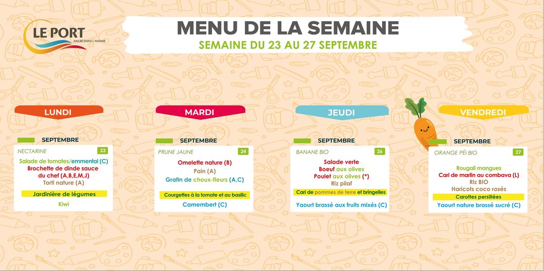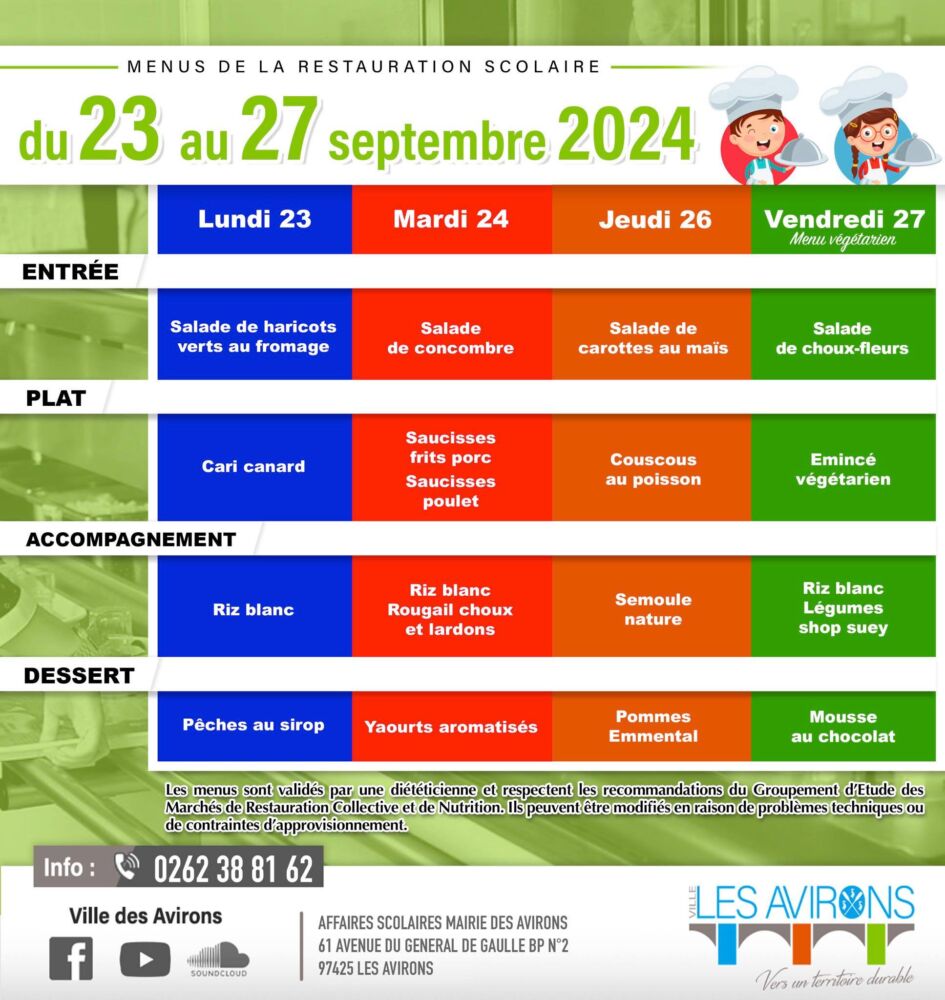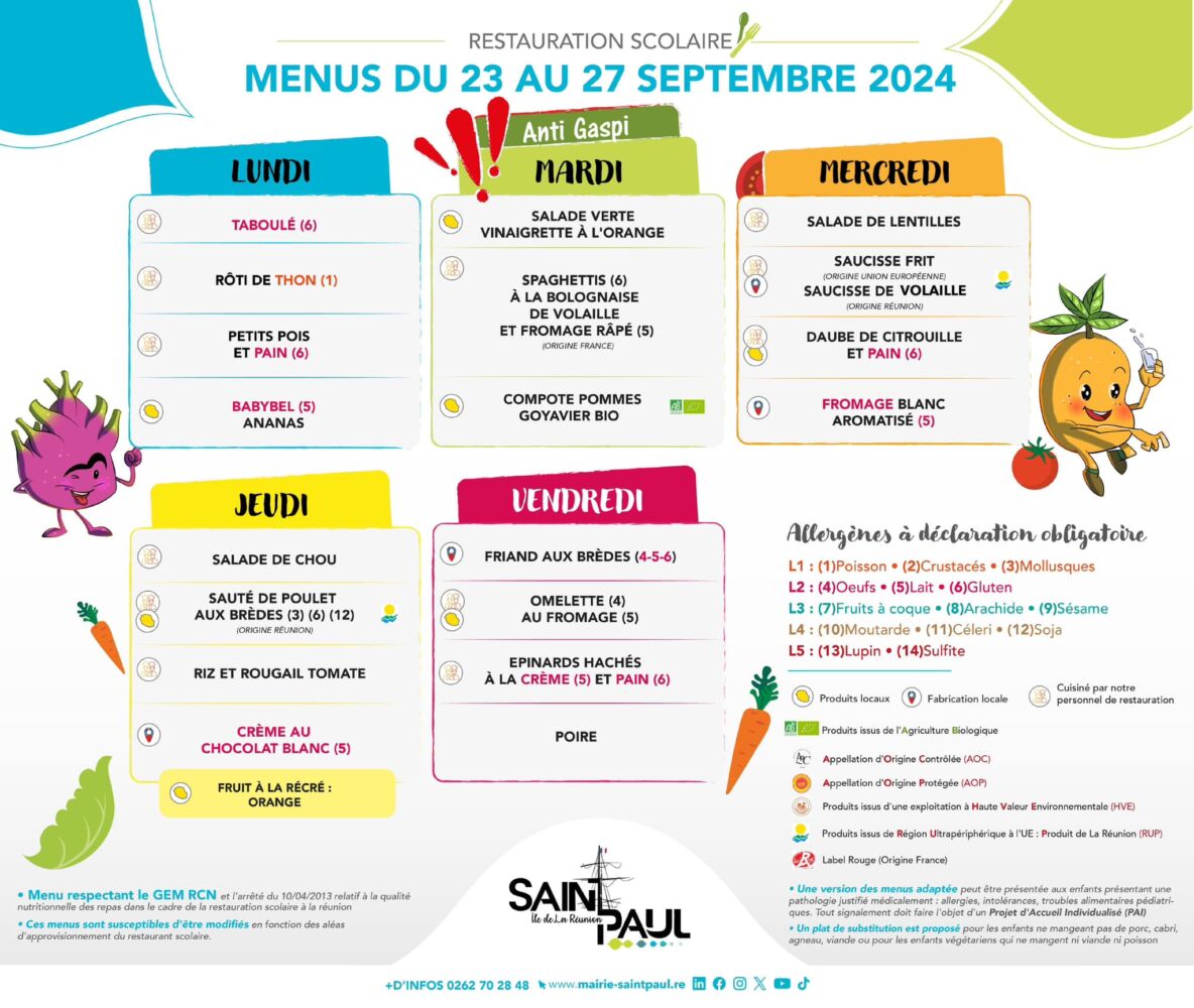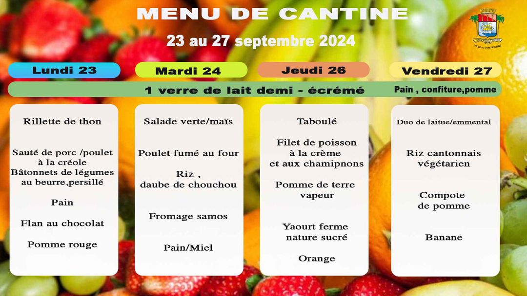 Les menus de la restauration scolaire du lundi 23 au 27 septembre.