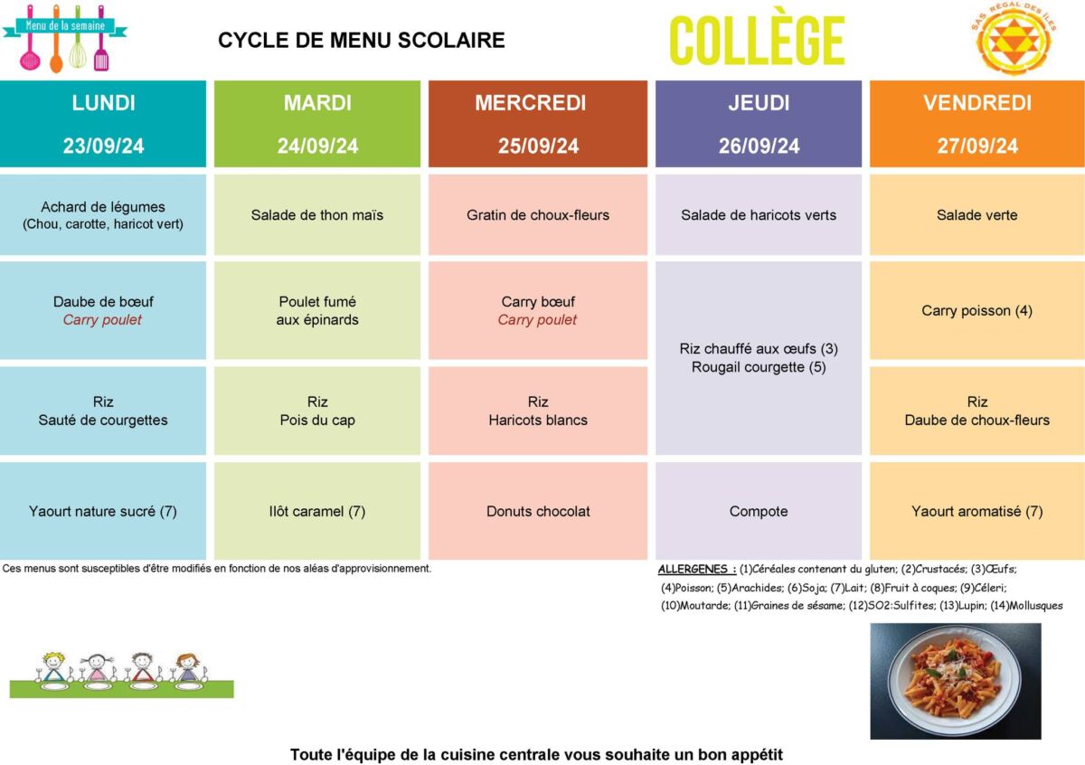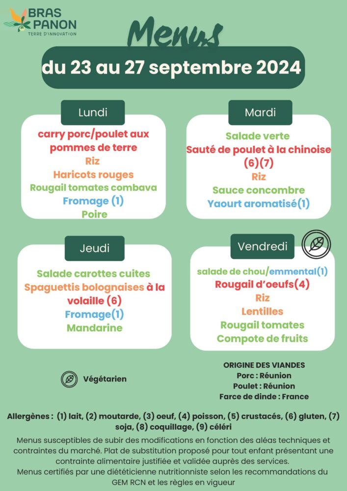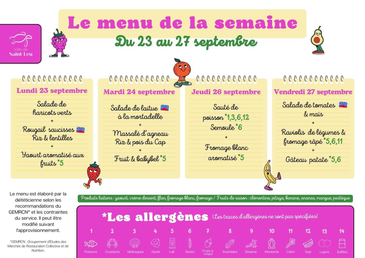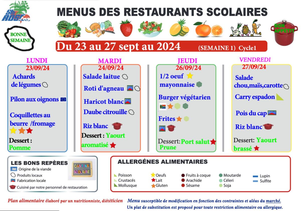 Les menus de la restauration scolaire du lundi 23 au 27 septembre.