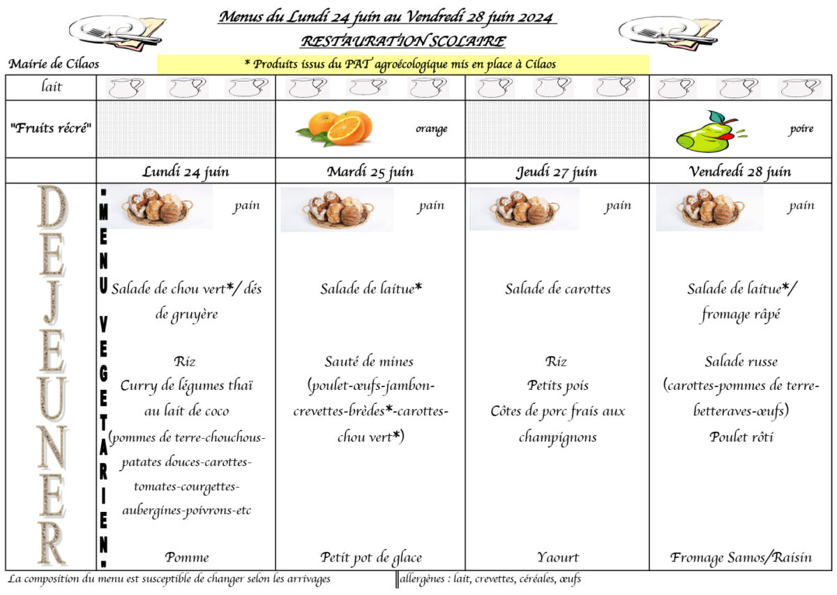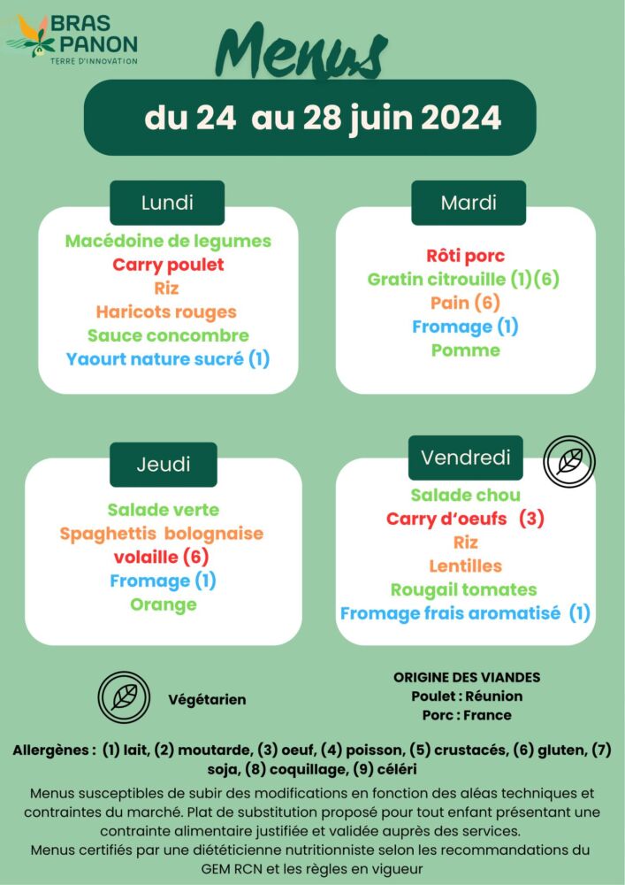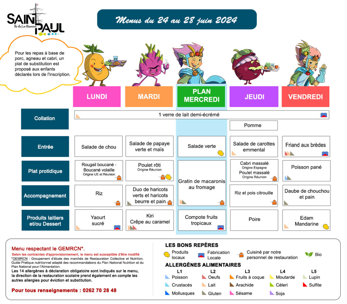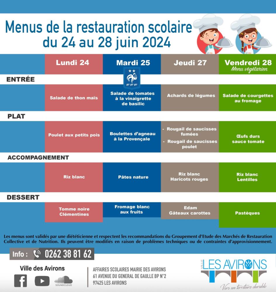 Actualités Kossa i manze à la cantine cette semaine du 24 au 28 juin par Céline Hardelain 24 juin 2024 1 min de lecture Les menus de la restauration scolaire du lundi 24 au vendredi 28 juin. Saint-Benoit Saint-Paul Les Avirons Bras-Panon Saint-Louis Cilaos Ne manquez pas toute l’actualité de La Réunion ! Abonnez-vous à la newsletter de Free Dom ! Valider Partager Facebook Twitter Pinterest Linkedin Whatsapp Reddit Email Vous pourriez être intéressé par 1 janvier 2026 Jeudi 1ᵉʳ janvier 2026 – Météo, éphéméride et horoscope du jour 31 décembre 2025 Mercredi 31 décembre 2025 – Météo, éphéméride et horoscope du jour 30 décembre 2025 Mardi 30 décembre 2025 – Météo, éphéméride et horoscope du jour Céline Hardelain Laisser un commentaire Annuler la réponseYour email address will not be published. Enregistrer mon nom, mon e-mail et mon site dans le navigateur pour mon prochain commentaire. Current ye@r * Leave this field empty Article précédent Grève des pompiers à la Plaine des Cafres Article suivant Sainte-Suzanne : restrictions nocturnes sur la RN2 pour travaux du 24 au 27 juin Articles récents... Jeudi 1ᵉʳ janvier 2026 – Météo, éphéméride et horoscope du jour Mercredi 31 décembre 2025 – Météo, éphéméride et horoscope du jour Hommage à Johnny Hallyday sur Free Dom 2 ce 5 décembre Mardi 30 décembre 2025 – Météo, éphéméride et horoscope du jour Saint-Joseph : découverte de 2337 plants de cannabis, arrestation de 2 individus Point sur le réseau routier départemental, 29 décembre à 16H30 Suicide sur le pont de la Rivière d’Abord : importante mobilisation des secours et des forces de l’ordre Radier submergé à Ilet Furcy : la route de Cilaos fermée à la circulation cette nuit Fortes pluies : appel à la plus grande prudence à Saint-Paul Saint-Gilles-les-Bains : une route impraticable, les riverains montent au créneau (VIDEOS)