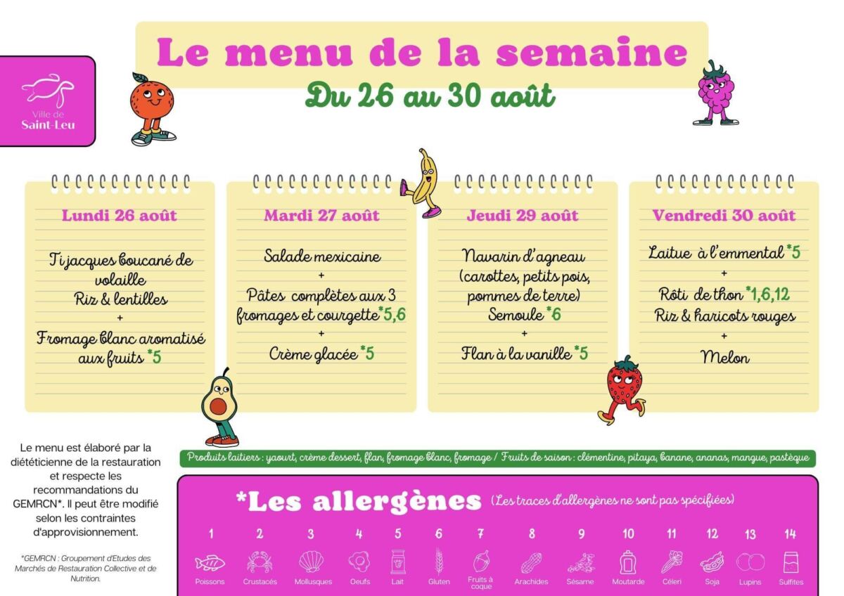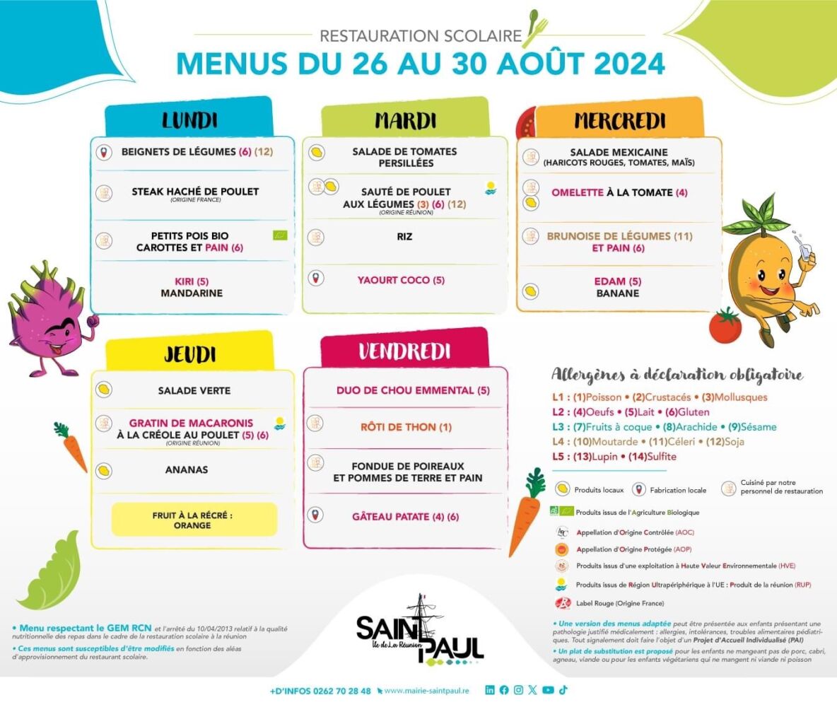 Actualités Kossa i manze à la cantine cette semaine du 26 au 30 août par Céline Hardelain 26 août 2024 1 min de lecture Les menus de la restauration scolaire du lundi 26 au vendredi 30 août. Saint-Pierre Saint-Louis Saint-Paul Le Tampon Etang-Salé Saint-Leu Salazie Ne manquez pas toute l’actualité de La Réunion ! Abonnez-vous à la newsletter de Free Dom ! Valider Partager Facebook Twitter Pinterest Linkedin Whatsapp Reddit Email Vous pourriez être intéressé par 1 janvier 2026 Jeudi 1ᵉʳ janvier 2026 – Météo, éphéméride et horoscope du jour 31 décembre 2025 Mercredi 31 décembre 2025 – Météo, éphéméride et horoscope du jour 30 décembre 2025 Mardi 30 décembre 2025 – Météo, éphéméride et horoscope du jour Céline Hardelain Laisser un commentaire Annuler la réponseYour email address will not be published. Enregistrer mon nom, mon e-mail et mon site dans le navigateur pour mon prochain commentaire. Current ye@r * Leave this field empty Article précédent Coupure d’eau à La Plaine des Palmistes ce mardi 27 août Article suivant Saint-Joseph : inauguration du terrain multisports de Vincendo Articles récents... Jeudi 1ᵉʳ janvier 2026 – Météo, éphéméride et horoscope du jour Mercredi 31 décembre 2025 – Météo, éphéméride et horoscope du jour Hommage à Johnny Hallyday sur Free Dom 2 ce 5 décembre Mardi 30 décembre 2025 – Météo, éphéméride et horoscope du jour Saint-Joseph : découverte de 2337 plants de cannabis, arrestation de 2 individus Point sur le réseau routier départemental, 29 décembre à 16H30 Suicide sur le pont de la Rivière d’Abord : importante mobilisation des secours et des forces de l’ordre Radier submergé à Ilet Furcy : la route de Cilaos fermée à la circulation cette nuit Fortes pluies : appel à la plus grande prudence à Saint-Paul Saint-Gilles-les-Bains : une route impraticable, les riverains montent au créneau (VIDEOS)