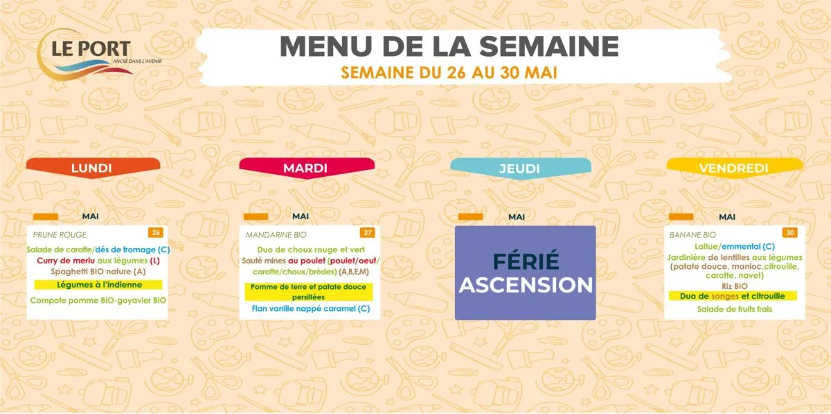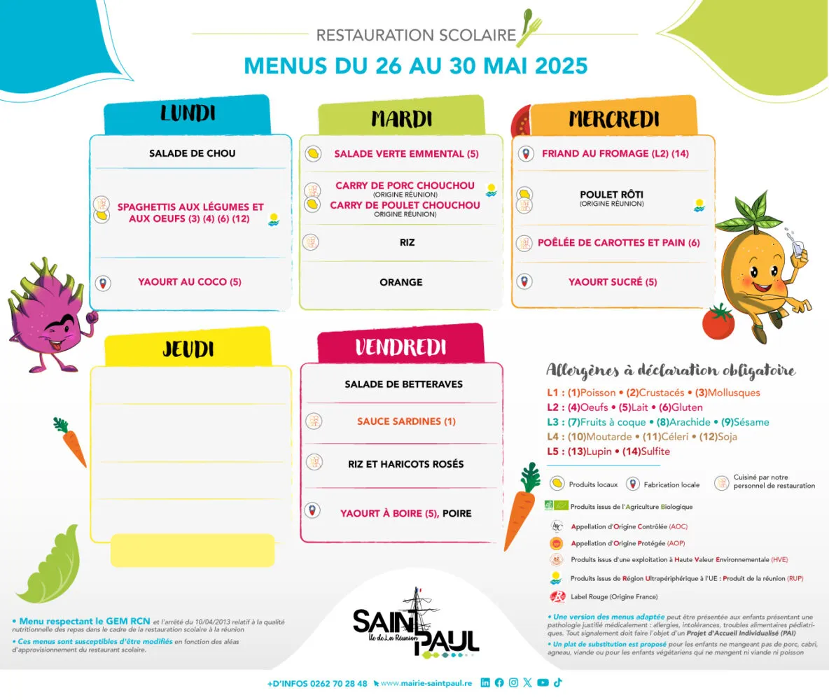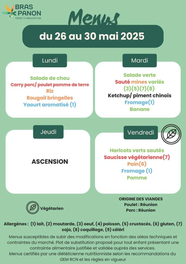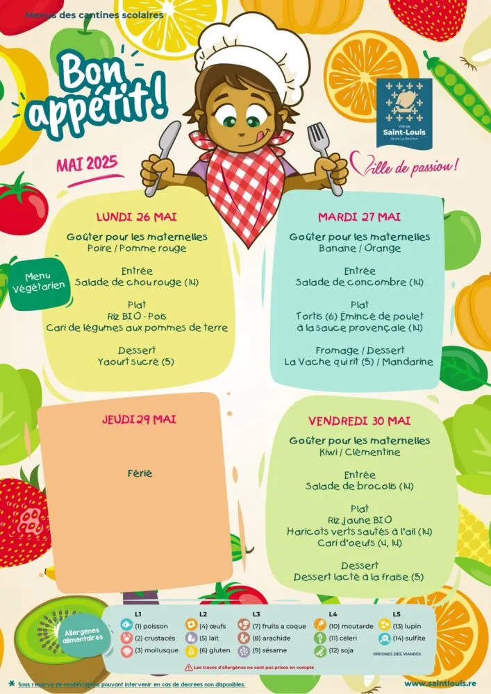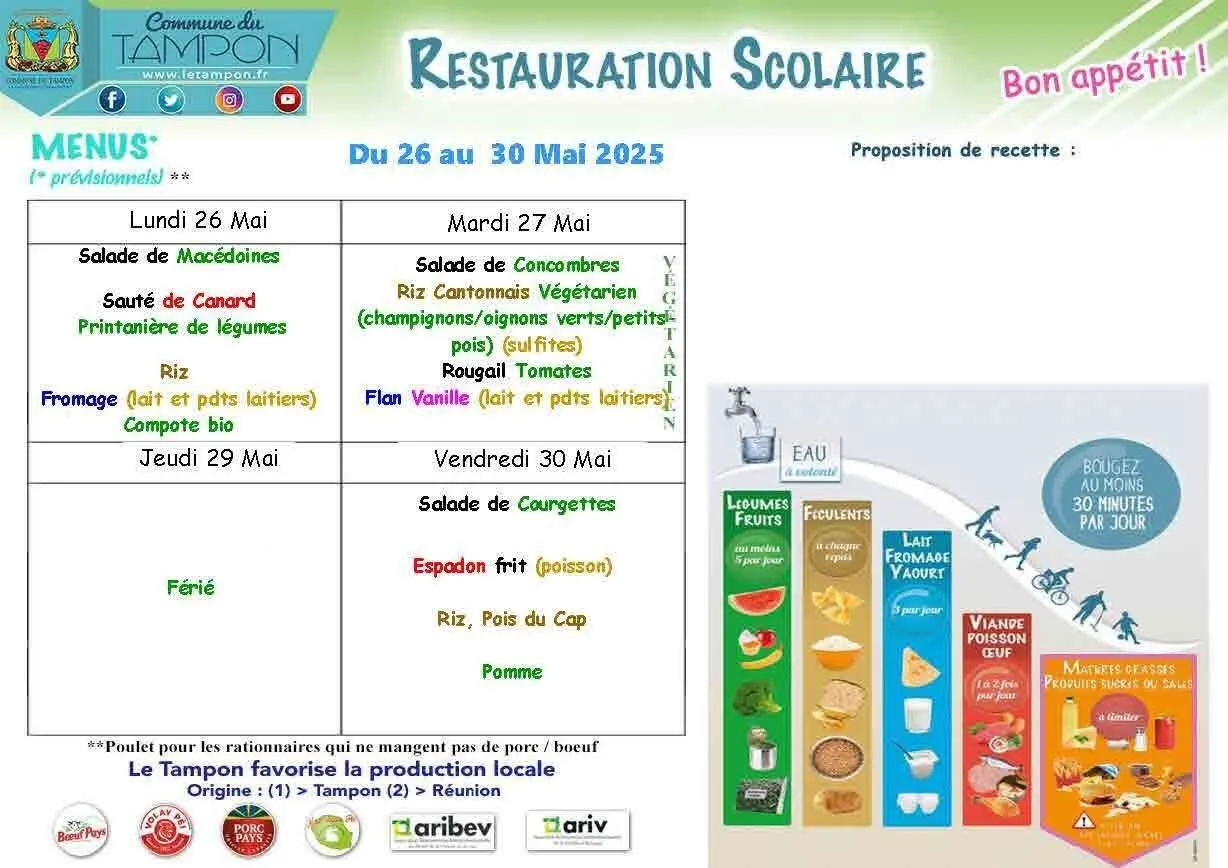 Actualités Kossa i manze à la cantine cette semaine du 26 au 30 mai par Céline Hardelain 26 mai 2025 1 min de lecture Kossa i manze à la cantine cette semaine ? Découvrez les menus pour nos marmailles du 26 mai au 30 mai Bras-Panon Etang-Salé Saint-Louis Saint-Benoit Saint-Paul Le Port Saint-Pierre Le Tampon Ne manquez pas toute l’actualité de La Réunion ! Abonnez-vous à la newsletter de Free Dom ! Valider Partager Facebook Twitter Pinterest Linkedin Whatsapp Reddit Email Vous pourriez être intéressé par 1 janvier 2026 Jeudi 1ᵉʳ janvier 2026 – Météo, éphéméride et horoscope du jour 31 décembre 2025 Mercredi 31 décembre 2025 – Météo, éphéméride et horoscope du jour 30 décembre 2025 Mardi 30 décembre 2025 – Météo, éphéméride et horoscope du jour Céline Hardelain Laisser un commentaire Annuler la réponseYour email address will not be published. Enregistrer mon nom, mon e-mail et mon site dans le navigateur pour mon prochain commentaire. Current ye@r * Leave this field empty Article précédent Lundi 25 mai 2025 : éphéméride horoscope et UNE du Quotidien Article suivant Drame à Maurice : un touriste réunionnais meurt en descendant de l’avion (Podcast) Articles récents... Jeudi 1ᵉʳ janvier 2026 – Météo, éphéméride et horoscope du jour Mercredi 31 décembre 2025 – Météo, éphéméride et horoscope du jour Hommage à Johnny Hallyday sur Free Dom 2 ce 5 décembre Mardi 30 décembre 2025 – Météo, éphéméride et horoscope du jour Saint-Joseph : découverte de 2337 plants de cannabis, arrestation de 2 individus Point sur le réseau routier départemental, 29 décembre à 16H30 Suicide sur le pont de la Rivière d’Abord : importante mobilisation des secours et des forces de l’ordre Radier submergé à Ilet Furcy : la route de Cilaos fermée à la circulation cette nuit Fortes pluies : appel à la plus grande prudence à Saint-Paul Saint-Gilles-les-Bains : une route impraticable, les riverains montent au créneau (VIDEOS)