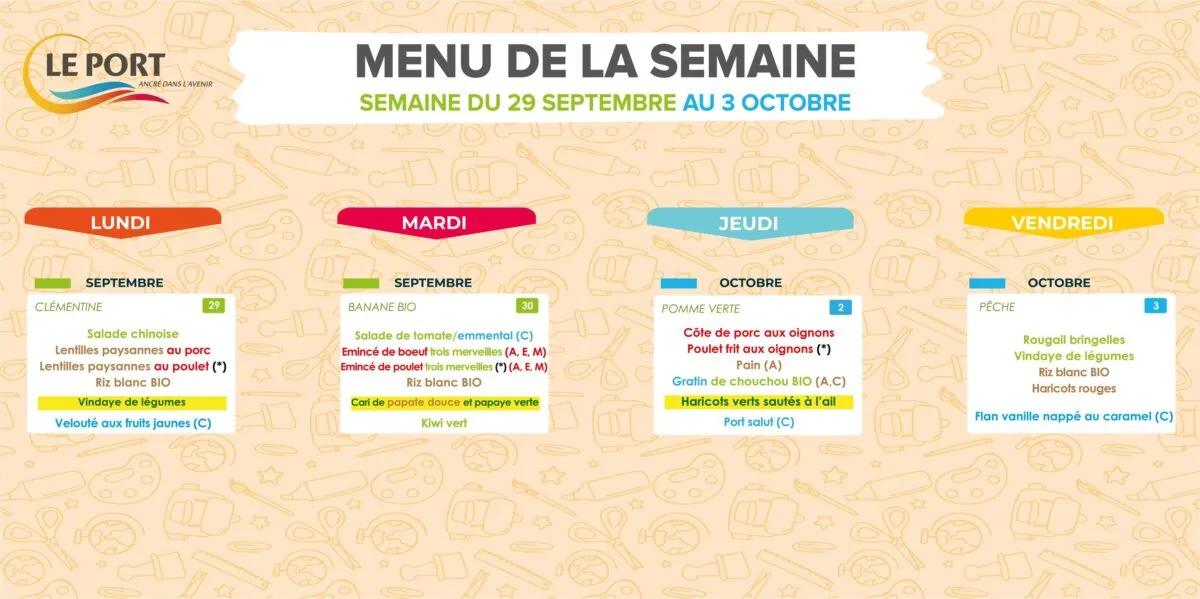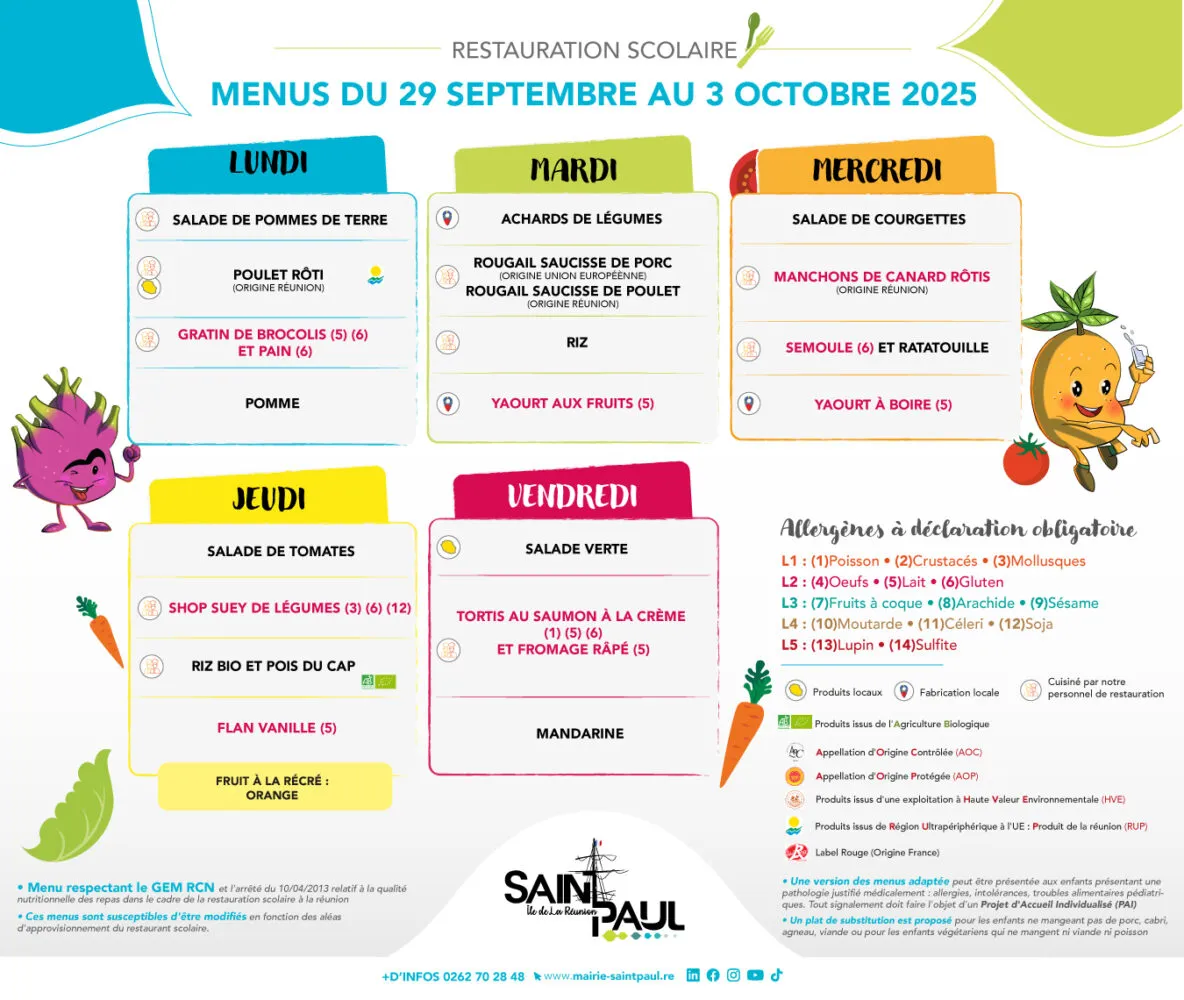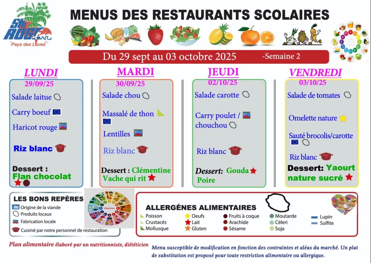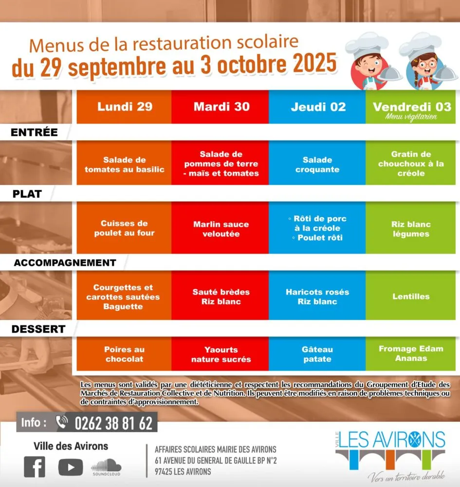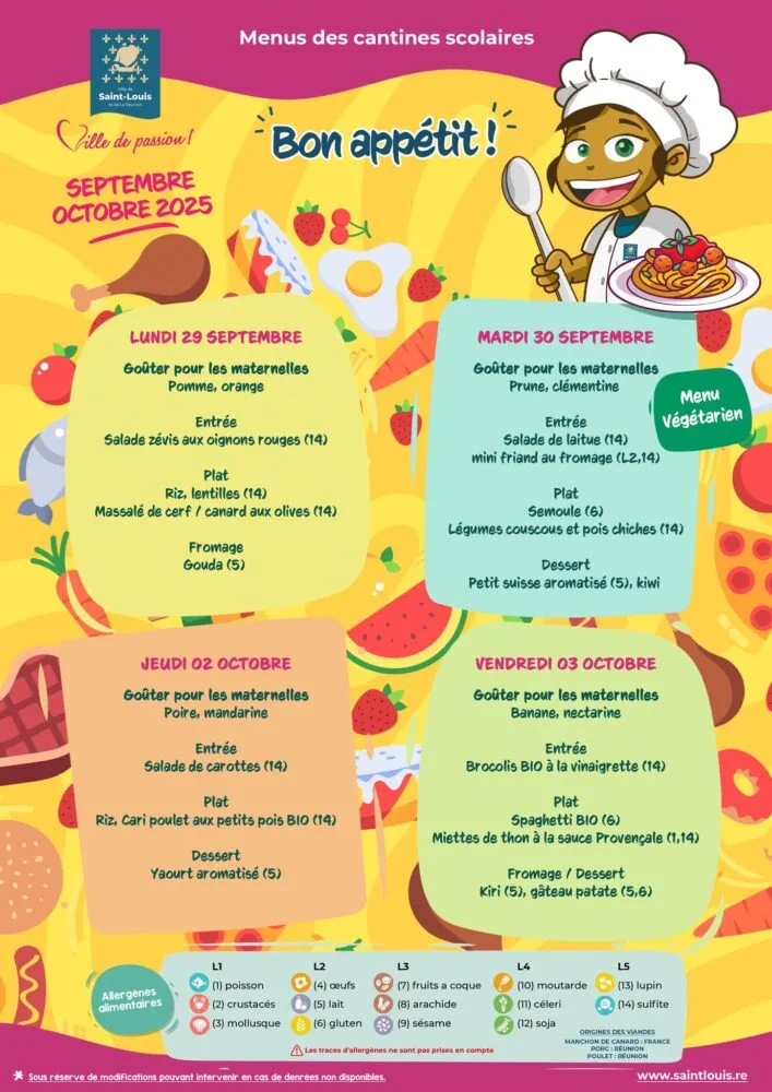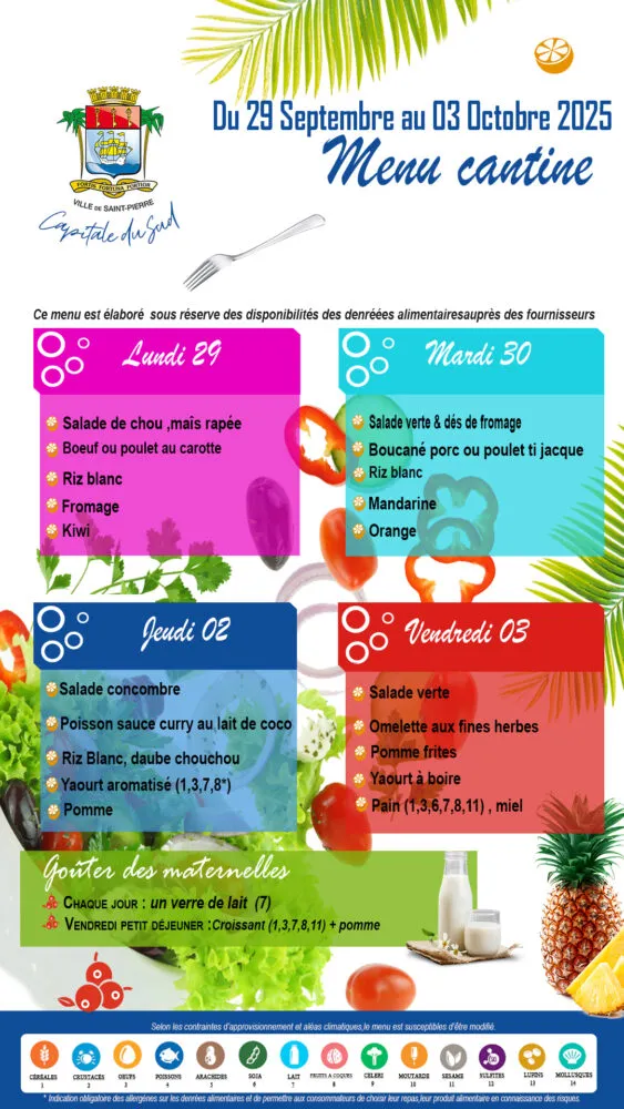 Actualités Kossa i manze à la cantine cette semaine du 29 septembre au 03 octobre par Céline Hardelain 29 septembre 2025 1 min de lecture Kossa i manze à la cantine cette semaine ? Découvrez les menus pour nos marmailles du 29 septembre au 03 octobre Bras-Panon Saint-Louis Les Avirons Saint-Benoit Saint-Paul Le Port Sainte-Rose Saint-Pierre Ne manquez pas toute l’actualité de La Réunion ! Abonnez-vous à la newsletter de Free Dom ! Valider Partager Facebook Twitter Pinterest Linkedin Whatsapp Reddit Email Vous pourriez être intéressé par 1 janvier 2026 Jeudi 1ᵉʳ janvier 2026 – Météo, éphéméride et horoscope du jour 31 décembre 2025 Mercredi 31 décembre 2025 – Météo, éphéméride et horoscope du jour 30 décembre 2025 Mardi 30 décembre 2025 – Météo, éphéméride et horoscope du jour Céline Hardelain Laisser un commentaire Annuler la réponseYour email address will not be published. Enregistrer mon nom, mon e-mail et mon site dans le navigateur pour mon prochain commentaire. Current ye@r * Leave this field empty Article précédent Vigilance JAUNE « vagues-submersion » jusqu’à 22h ce lundi Article suivant Sainte-Suzanne : Olivier Dugain appelle à un rassemblement ce lundi 29 septembre et demande l’ajournement du conseil municipal Articles récents... Jeudi 1ᵉʳ janvier 2026 – Météo, éphéméride et horoscope du jour Mercredi 31 décembre 2025 – Météo, éphéméride et horoscope du jour Hommage à Johnny Hallyday sur Free Dom 2 ce 5 décembre Mardi 30 décembre 2025 – Météo, éphéméride et horoscope du jour Saint-Joseph : découverte de 2337 plants de cannabis, arrestation de 2 individus Point sur le réseau routier départemental, 29 décembre à 16H30 Suicide sur le pont de la Rivière d’Abord : importante mobilisation des secours et des forces de l’ordre Radier submergé à Ilet Furcy : la route de Cilaos fermée à la circulation cette nuit Fortes pluies : appel à la plus grande prudence à Saint-Paul Saint-Gilles-les-Bains : une route impraticable, les riverains montent au créneau (VIDEOS)