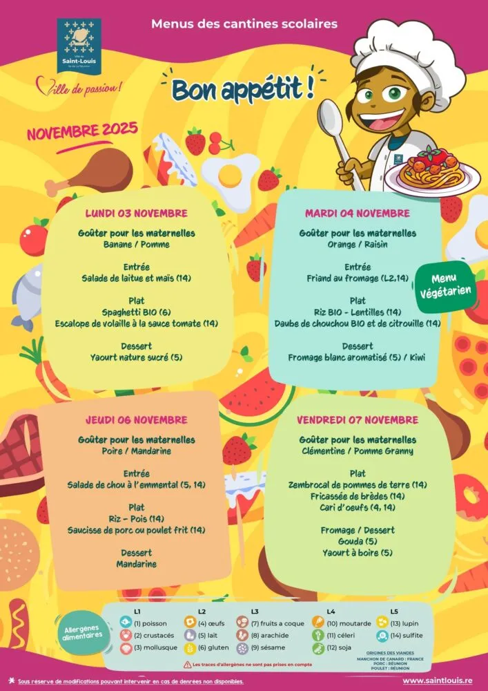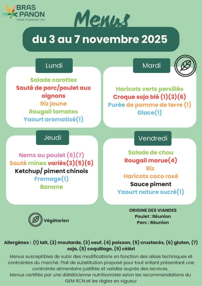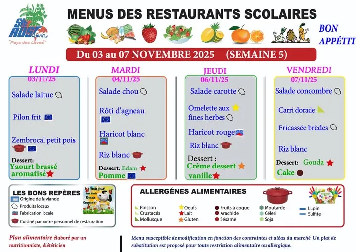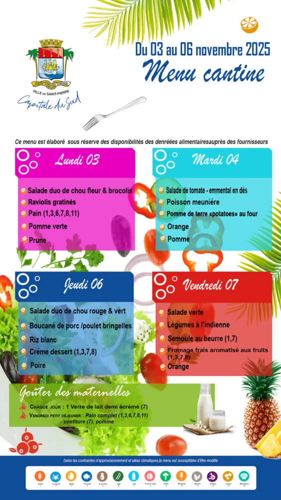 Actualités Kossa i manze à la cantine cette semaine du 3 au 7 novembre par Céline Hardelain 3 novembre 2025 1 min de lecture Kossa i manze à la cantine cette semaine ? Découvrez les menus pour nos marmailles du 3 au 7 novembre. Saint-Louis Saint-Pierre Bras-Panon Saint-Paul Sainte-Rose Le Port Ne manquez pas toute l’actualité de La Réunion ! Abonnez-vous à la newsletter de Free Dom ! Valider Partager Facebook Twitter Pinterest Linkedin Whatsapp Reddit Email Vous pourriez être intéressé par 31 décembre 2025 Mercredi 31 décembre 2025 – Météo, éphéméride et horoscope du jour 30 décembre 2025 Mardi 30 décembre 2025 – Météo, éphéméride et horoscope du jour 29 décembre 2025 Saint-Joseph : découverte de 2337 plants de cannabis, arrestation de 2 individus Céline Hardelain Laisser un commentaire Annuler la réponseYour email address will not be published. Enregistrer mon nom, mon e-mail et mon site dans le navigateur pour mon prochain commentaire. Current ye@r * Leave this field empty Article précédent Transport sanitaire : une réforme qui met en danger les patients réunionnais, selon les taxis Article suivant Un premier parc canin verra bientôt le jour à Saint-Denis Articles récents... Mercredi 31 décembre 2025 – Météo, éphéméride et horoscope du jour Hommage à Johnny Hallyday sur Free Dom 2 ce 5 décembre Mardi 30 décembre 2025 – Météo, éphéméride et horoscope du jour Saint-Joseph : découverte de 2337 plants de cannabis, arrestation de 2 individus Point sur le réseau routier départemental, 29 décembre à 16H30 Suicide sur le pont de la Rivière d’Abord : importante mobilisation des secours et des forces de l’ordre Radier submergé à Ilet Furcy : la route de Cilaos fermée à la circulation cette nuit Fortes pluies : appel à la plus grande prudence à Saint-Paul Saint-Gilles-les-Bains : une route impraticable, les riverains montent au créneau (VIDEOS) Très grands excès de vitesse : un délit passible de prison depuis le 29 décembre 2025